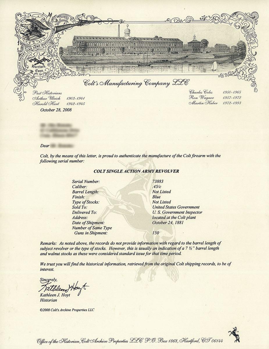 According to the included factory letter, this was one of 150 revolvers delivered to the Government Inspector on 24 October 1881 (grips/ barrel "Not Listed", remainder verified). Fixed sights, Clark inspector marks, smooth grips stamped "1882".
