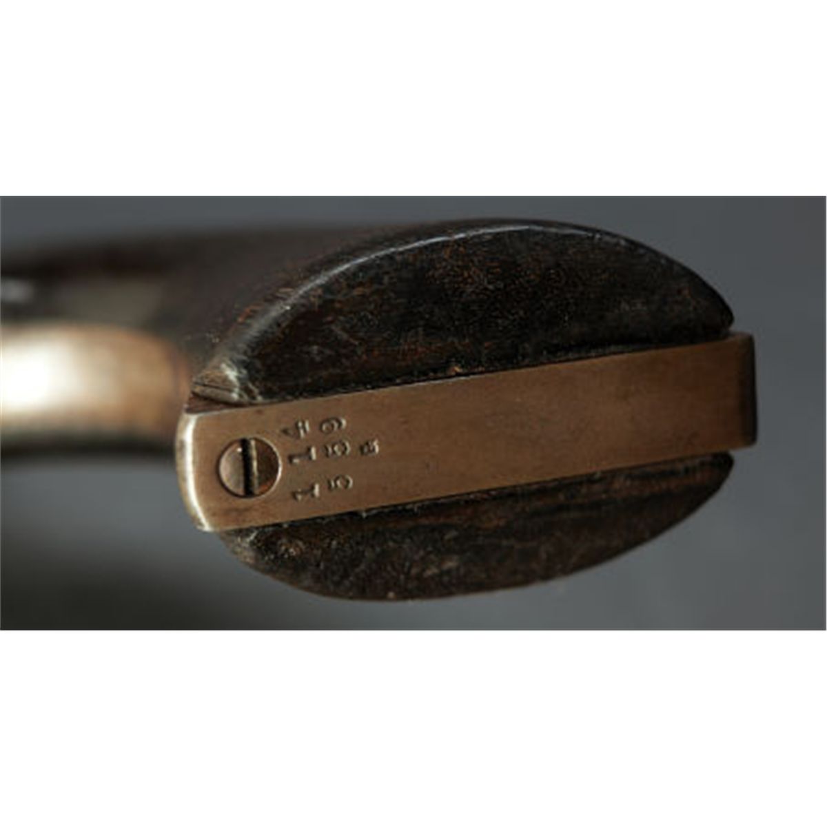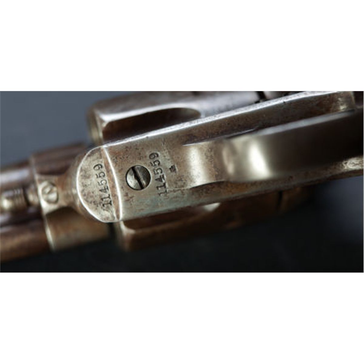 U.S. Colt Single Action Army Revolver. Serial no. 114559, .45 caliber, 7 1/2-inch barrel marked: P/D.F.C. on bottom near cylinder pin. Gripstrap and frame with "G" inspector stamps. Left side of frame lacking U.S. markings but having three-line patent dates and "K" inspector stamp. Cylinder with "P" inspector stamp. Varnished walnut grips with no inspector's cartouche. Sold with Colt factory letter stating that this revolver was shipped to Kennedy & Curtis, Philadelphia, Pennsylvania on October 6, 1888. It was shipped with blue finish, stocks not mentioned,in a shipment of 10 guns. According to consignor, John Kopec was of the opinion that this could possibly be a condemned gun or an overrun. There is no "C" stamp for condemned but an overrun is a likely possibility. This serial number is in the range of those examples sent to the New York Militia. Condition: Good. Metal with mottled grey-brown age patina with patches of pitting on cylinder and frame. Grips retaining approximately 60-70% varnish with scattered flaking and wear. Chips to toes of grips. Action crisp. Bore good.