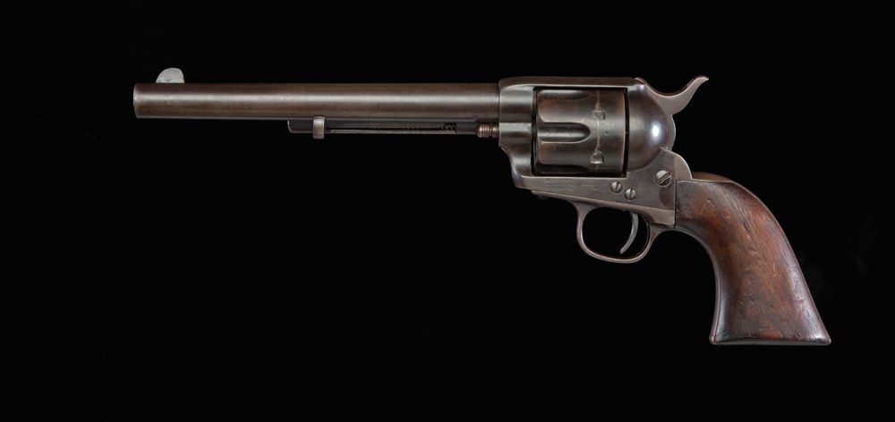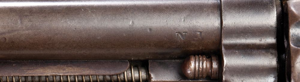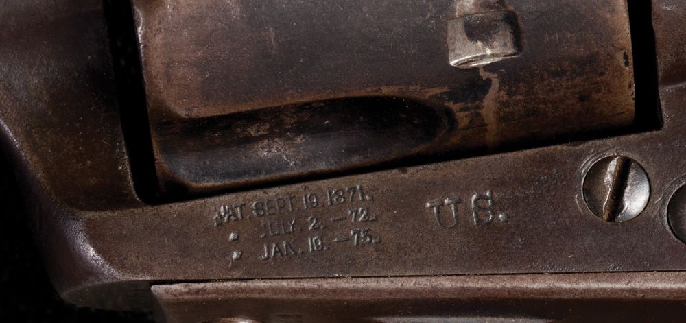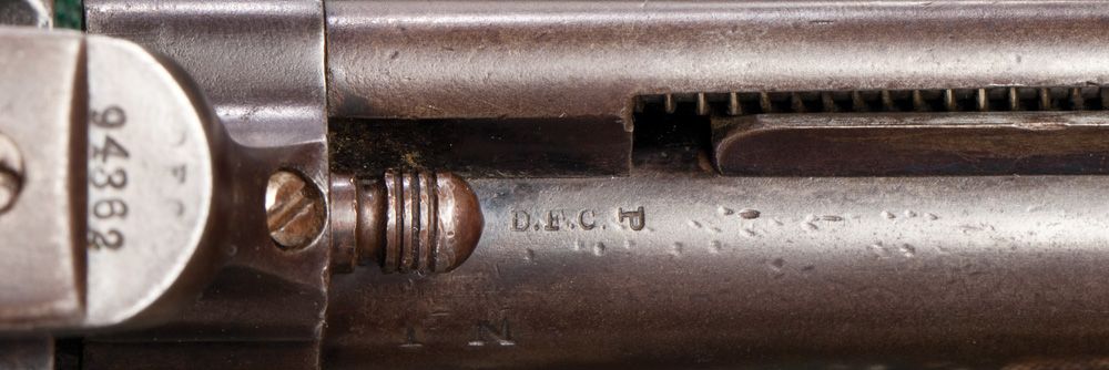 “New Jersey Militia” martially marked revolver in standard configuration and all original, .45, 7 1/2” blue. Factory letter, shipped August 3, 1883, serial #94362. D.F.C. (David F. Clark) inspected revolver. Also “G” sub inspector marked on trigger guard and butt. Overall brown with clear markings and all matching numbers. Grips show no cartouche.