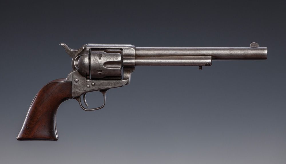 U. S. Colt Single Action. S/N 30994, circa 1876-77, .45 LC, U. S. Cavalry purchase, 7 1/2" barrel, correct block one line barrel address, correct ejector housing and rod head, type II hammer knurling, J. T. Cleveland inspected. Bottom of barrel marked “5 CAV.” CONDITION: Overall soft gray finish, clear JTC on frame, area of barrel behind 5 CAV mark has been marked by someone trying to get cylinder pin removed, US and patent marks are faint, all numbers match, very good walnut grips are slightly undersized. In 1876 and 1877 the 5th Cavalry was active in the Southwest, then in the Dakotas, Montana and Wyoming.