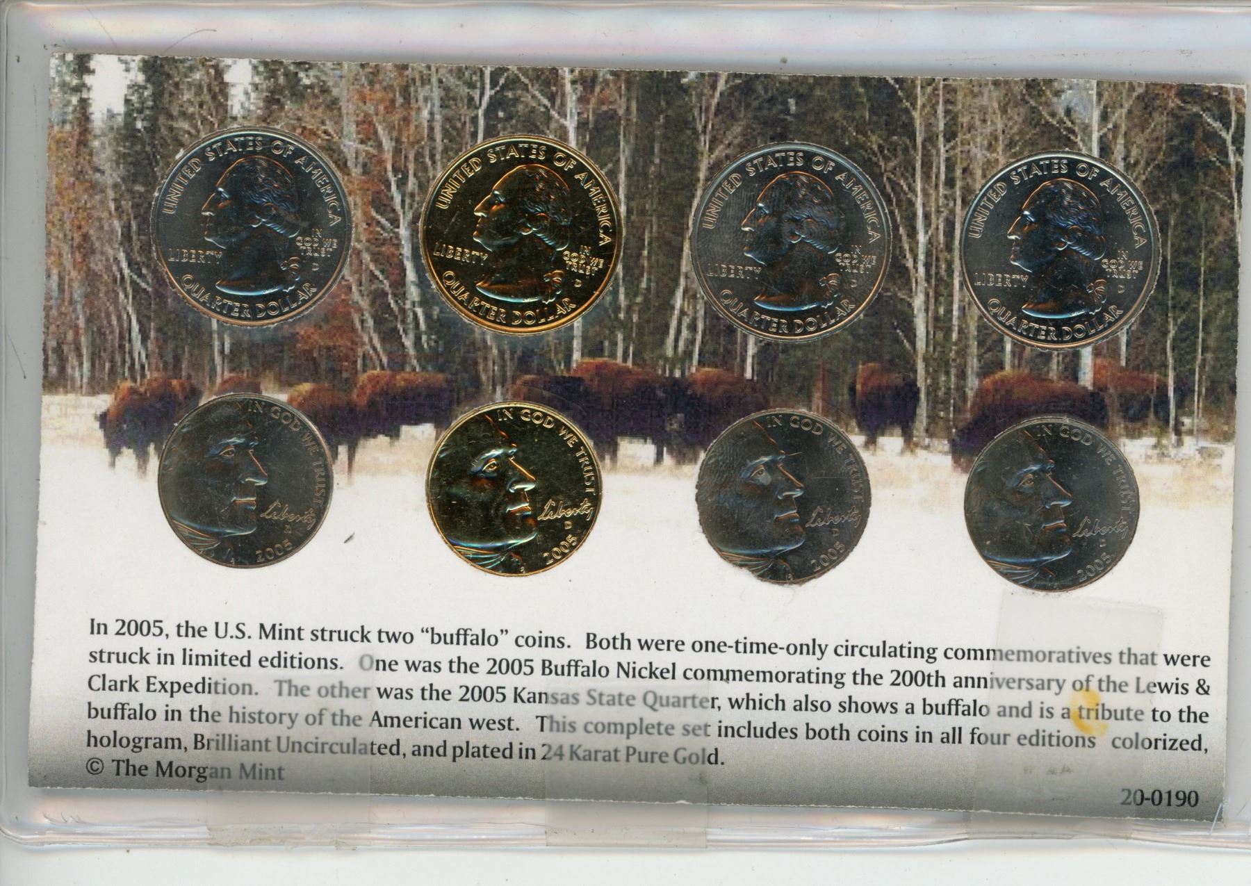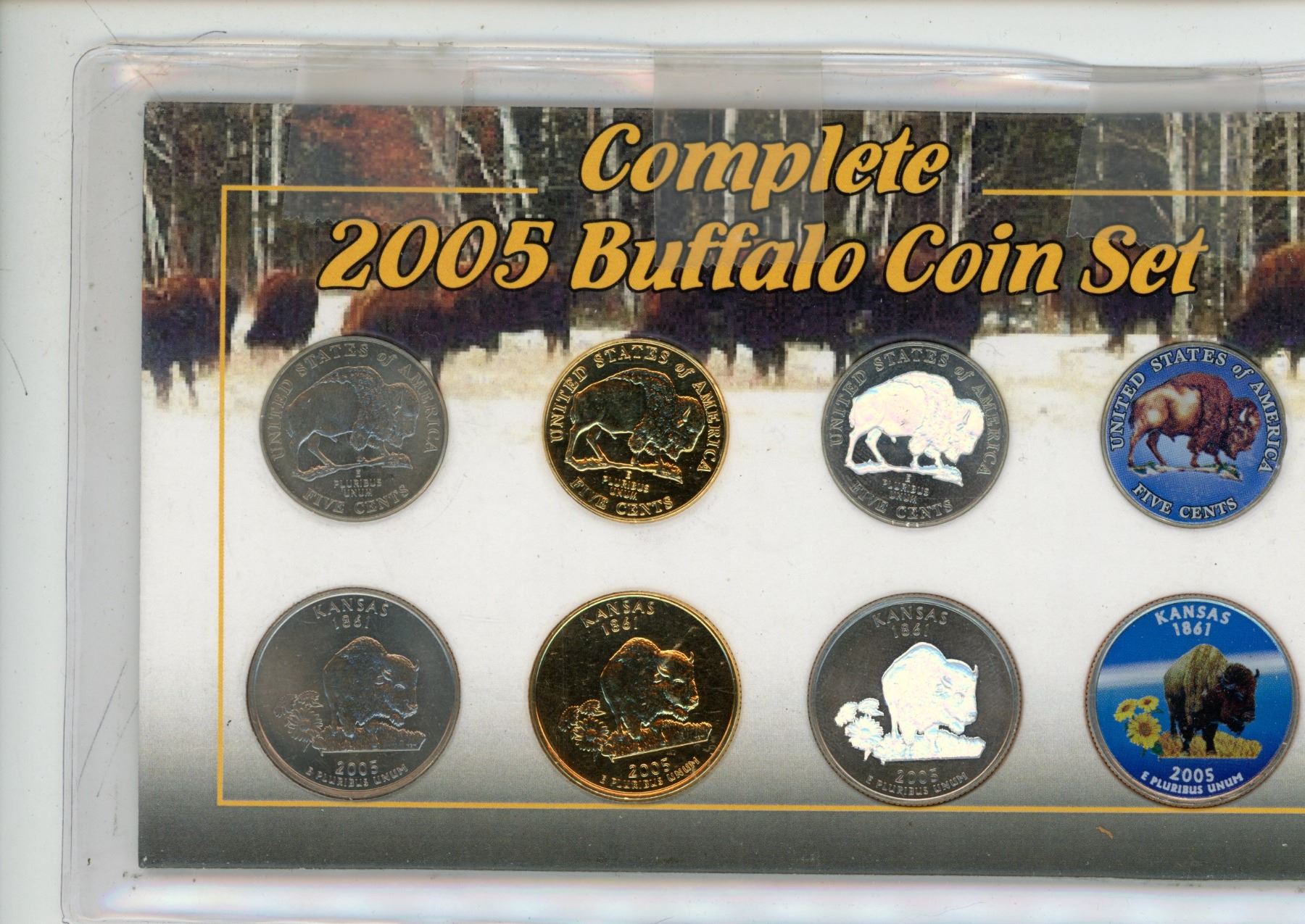 U.S. Complete 2005 Buffalo Coin Set. 4 nickels & 4 quarters including regular, gold-plated, hologram, and coloured. Housed in a Morgan Mint package.