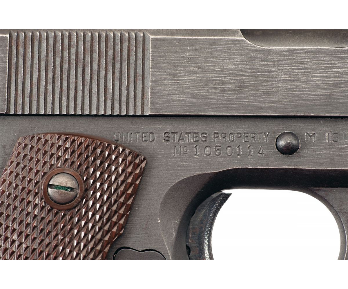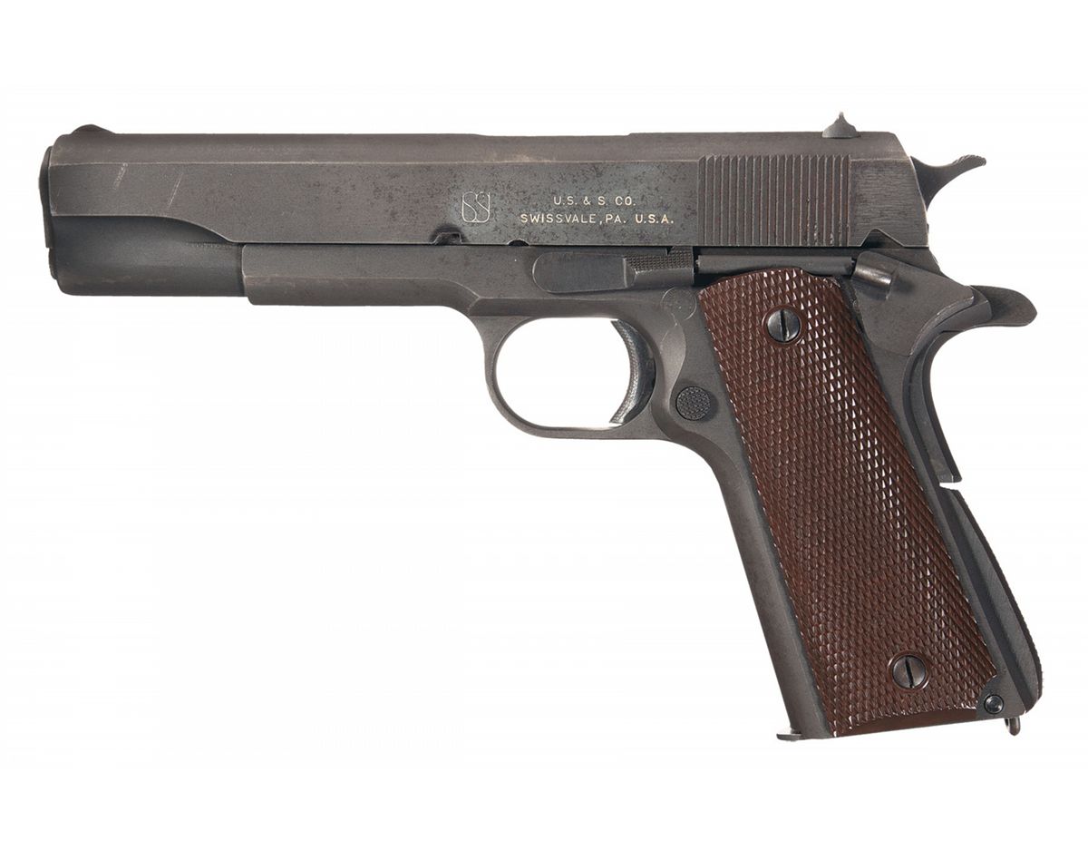 This is an excellent example of a scarce type I variation of Model 1911A1 pistol as manufactured by the Union Switch & Signal Company in 1943. Union Switch & Signal only made one block of contract pistols in 1943. The left side of the slide is marked with the intertwined "USS" for the Union Switch and Signal Co. and "U.S.& S. CO./SWISSVALLE, PA. U.S.A.". The left side of the frame is marked with the circular proof of "RCD" for LTC Robert Downie the U.S. Government inspector. The right side of the frame is marked "UNITED STATES PROPERTY" over the serial number and "M1911A1 U.S. ARMY". "HS" marked barrel, the trigger is blue. The trigger, slide stop, thumb safety, hammer and arched mainspring housing are all checkered. The grips are brown checkered plastic with reinforcing rings around the screws. The magazine is blue with no markings.