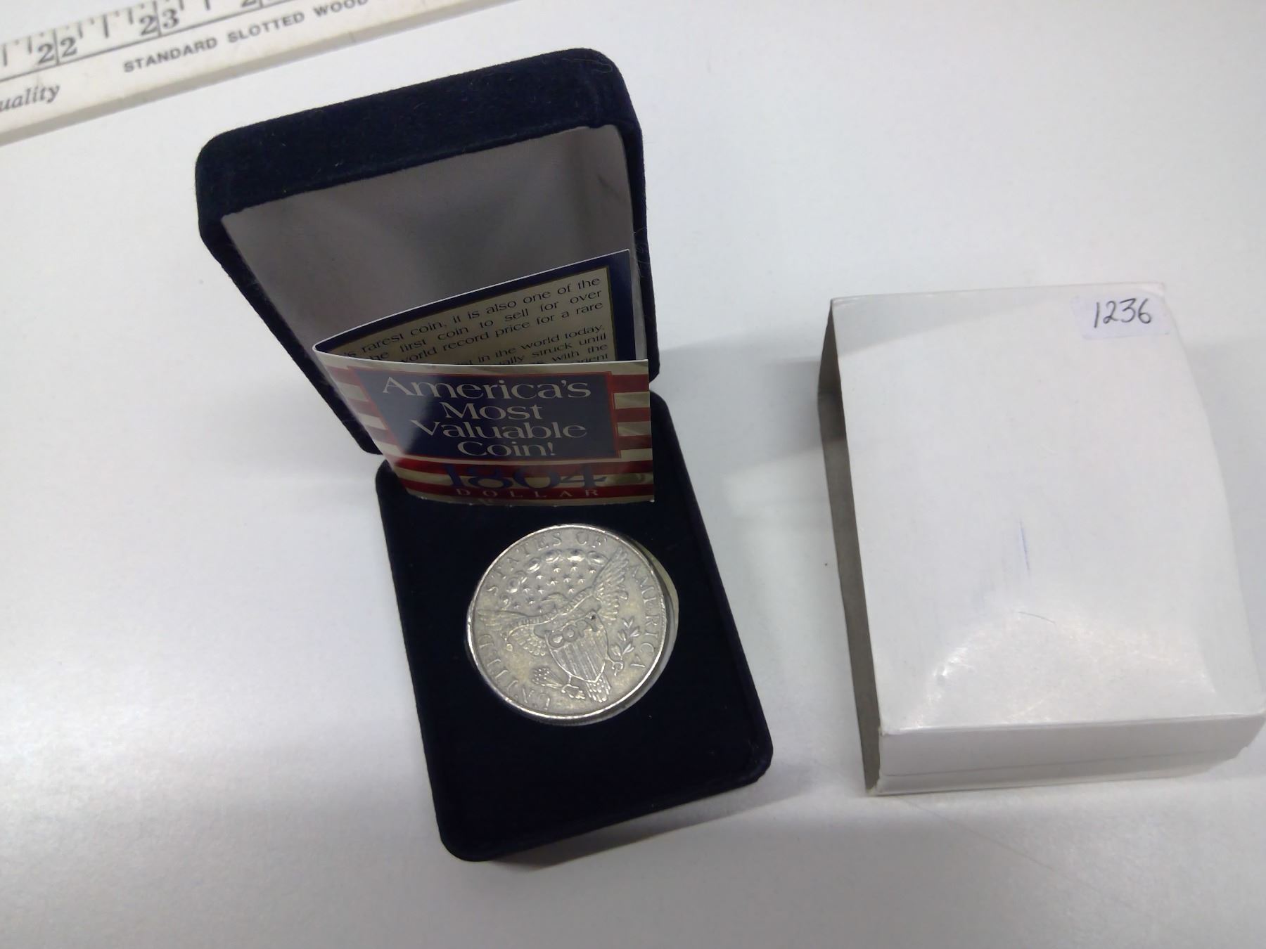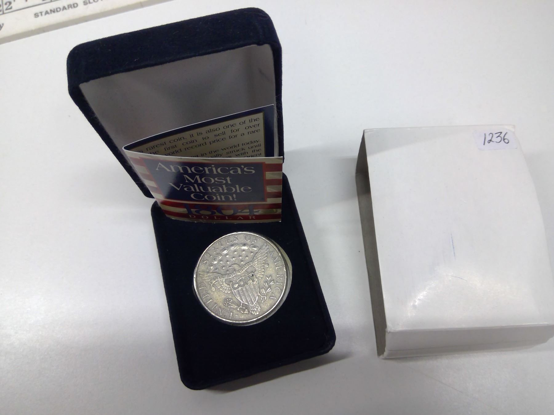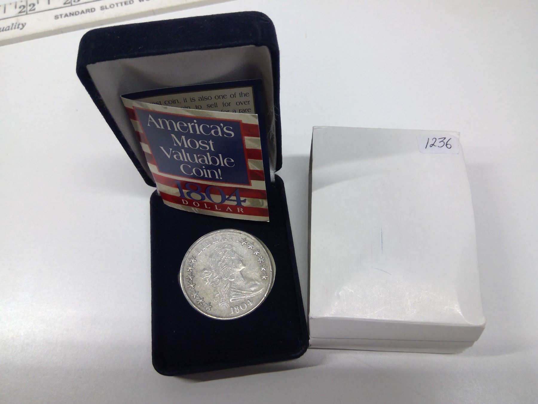 U.S. Copy 1804 Silver Dollar, America’s Most Valuable Coin. Can’t afford a real one, this one is marked COPY. Housed in a black case.