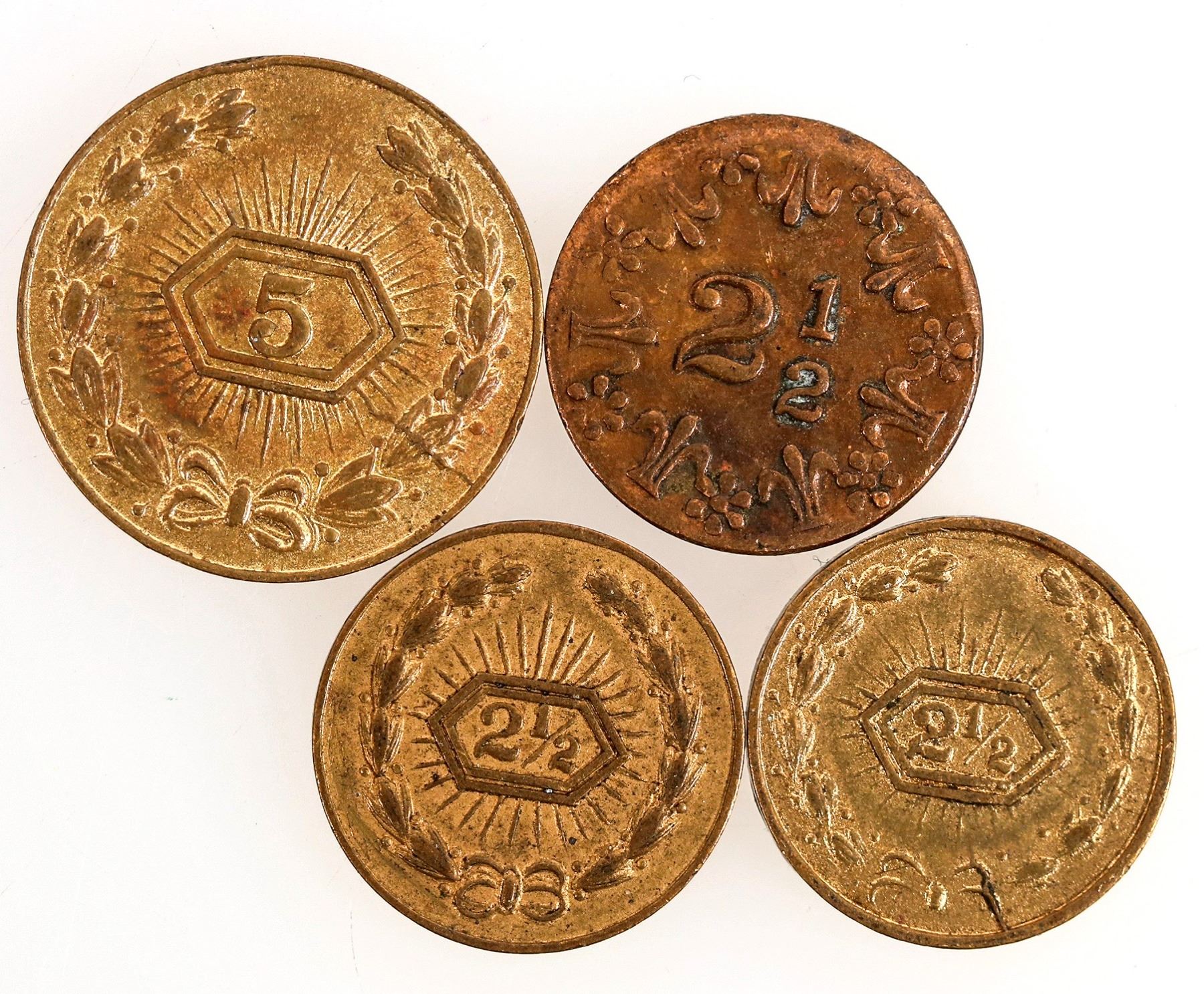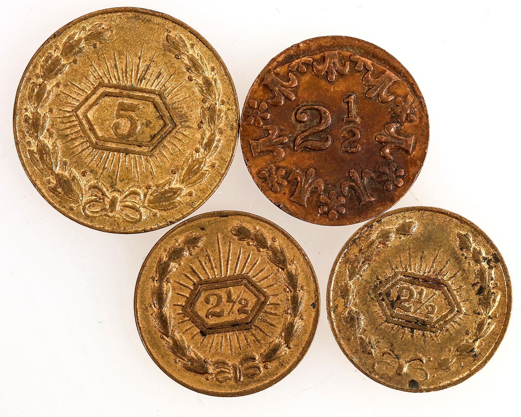 Four counters, circa 1890-1910. "Gold coin" counters, three the size of a $2 1/2 gold piece, one the size of a $5 gold piece.