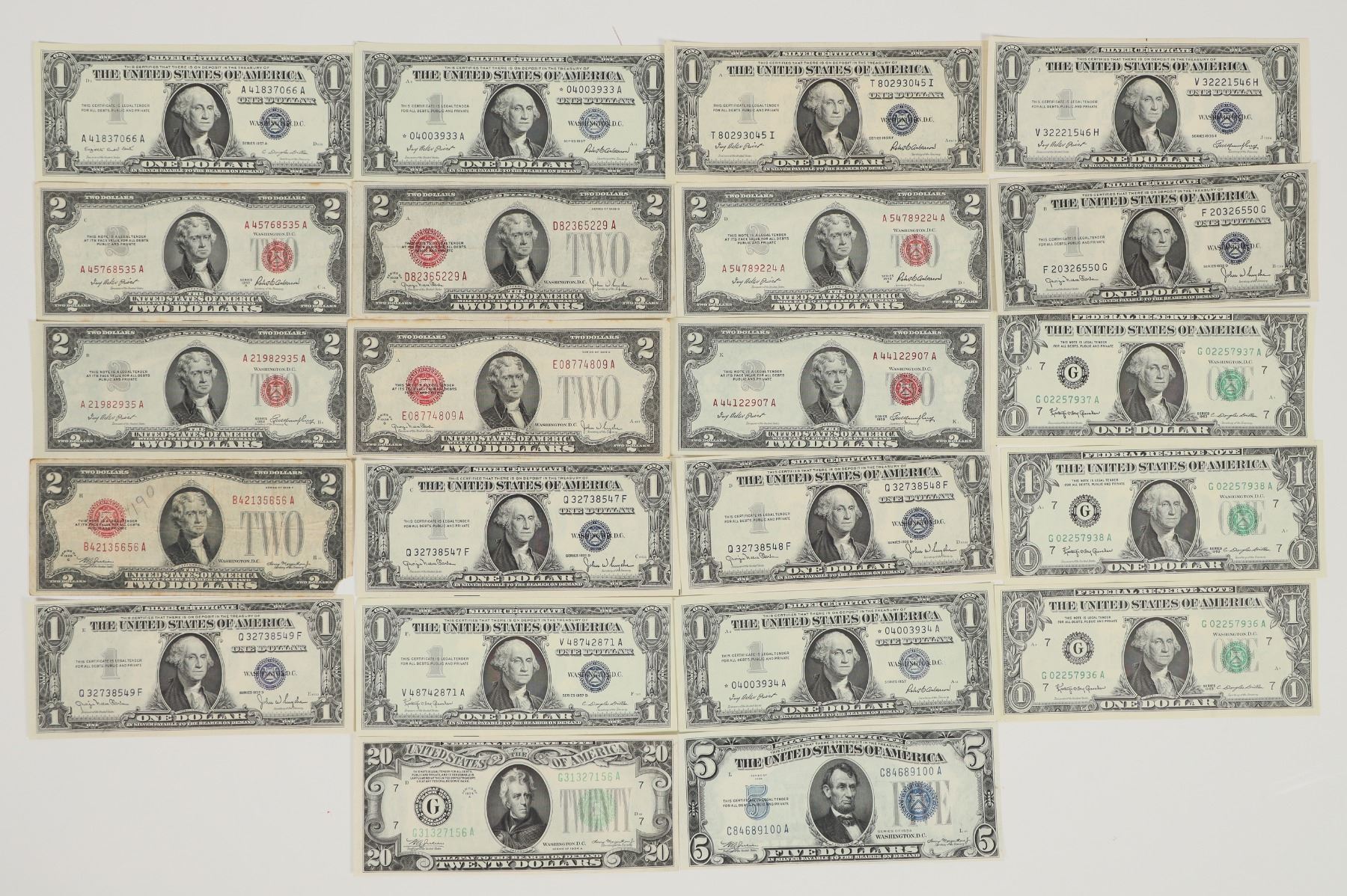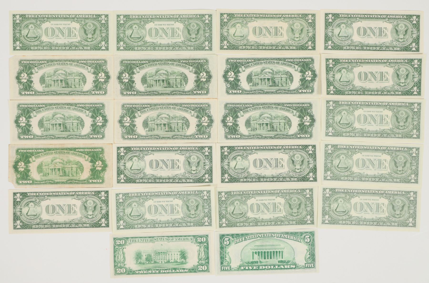 Three sequentially numbered, crisp uncirculated $1 federal reserve notes Series of 1963; nine crisp uncirculated $1 Silver Certificates; seven $2 United States Notes, Series of 1928 & 1963, some EF, some Uncirculated; one Series of 1934 $5 Silver Certificate, crisp uncirculated; one crisp uncirculated $20 Federal Reserve Note Series of 1934 A.