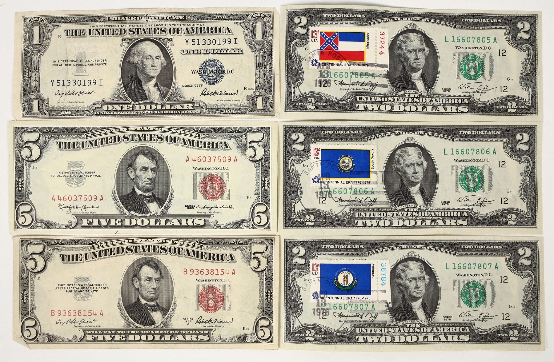 Seventy three $1 federal reserve notes signed by Joseph W. Barr; Series 1935 F $1 silver certificate; 25 $2 bills with cancelled statehood stamps; three $5 united states notes.