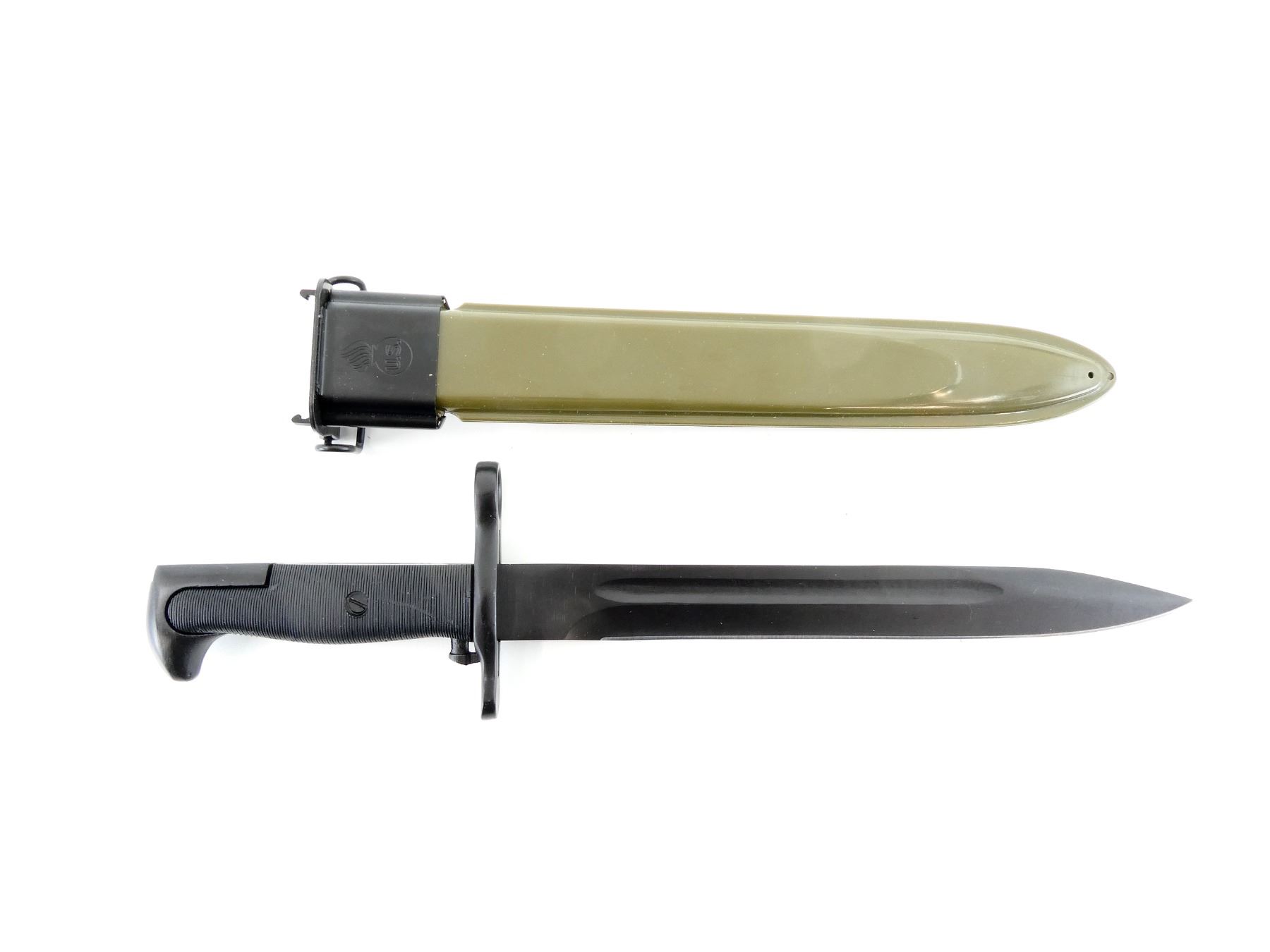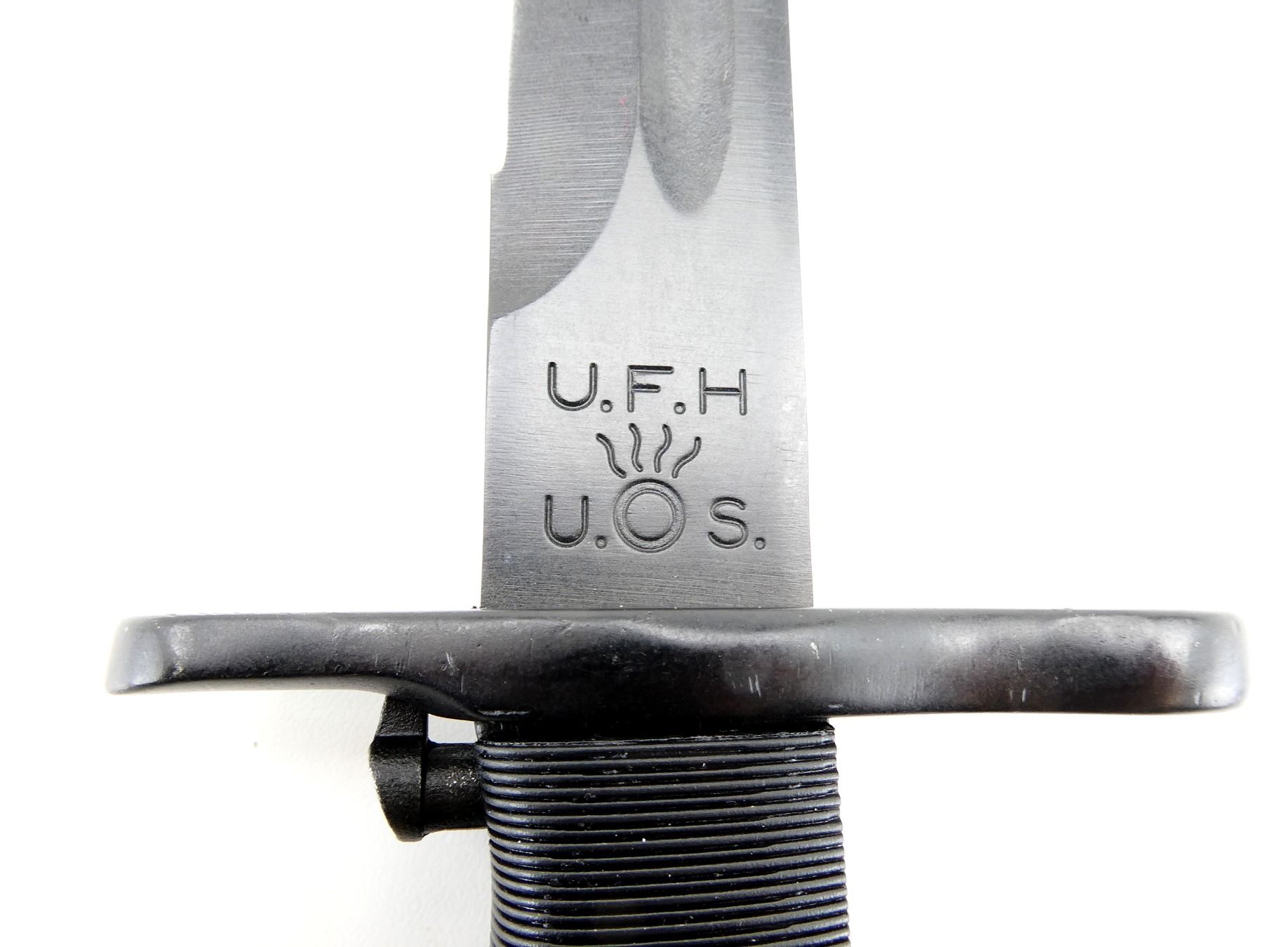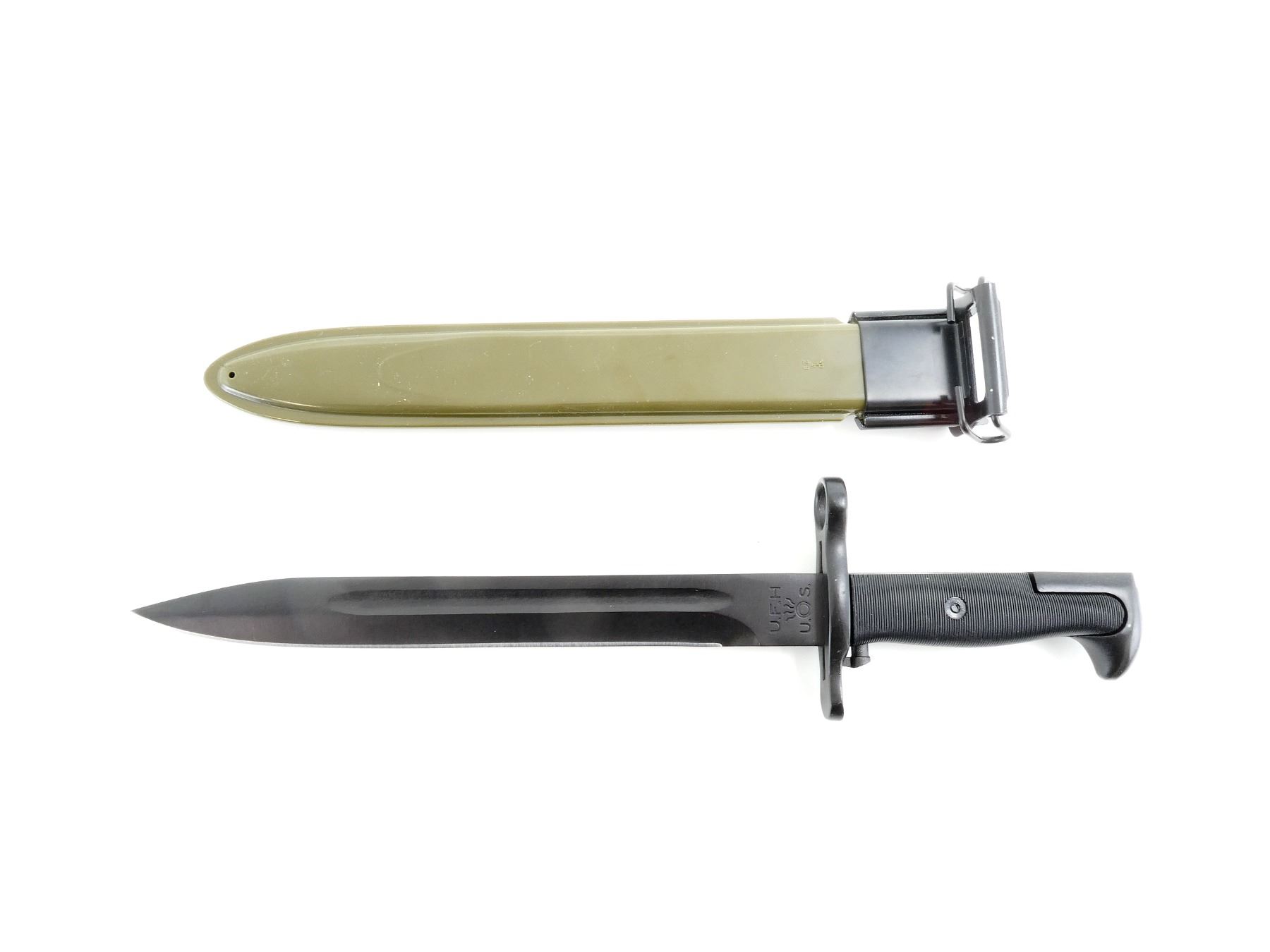 (1) NOS, OPENED FOR PICTURES, FITS .30-06 M1, M1903 & M1903A3 RIFLES, RICASSO MARKED: "U.F.H" OVER "U.", ORDNANCE BOMB, "S.", BLACK POLYMER GRIP, METAL POMMEL, NO VISIBLE MARKINGS, M1 GARAND GREEN POLYMER SCABBARD WITH METAL BELT HOOKS, MARKED: "U.S." INSIDE ORDNANCE BOMB & "VP (VICTORY PLASTICS)" OVER "29", BLADE APPROX. 9 7/8" & OAL APPROX. 14.5". SEE PHOTOS.