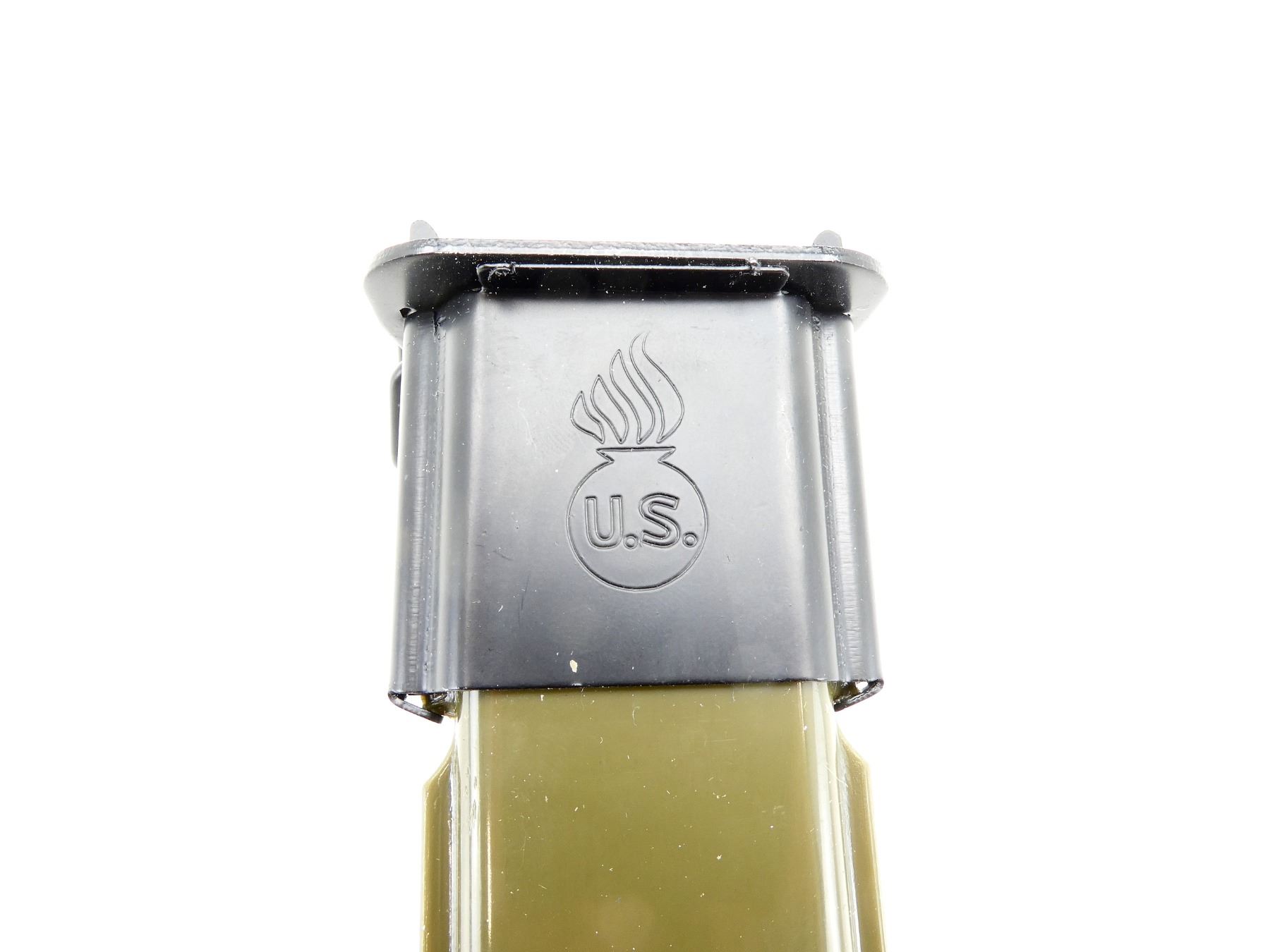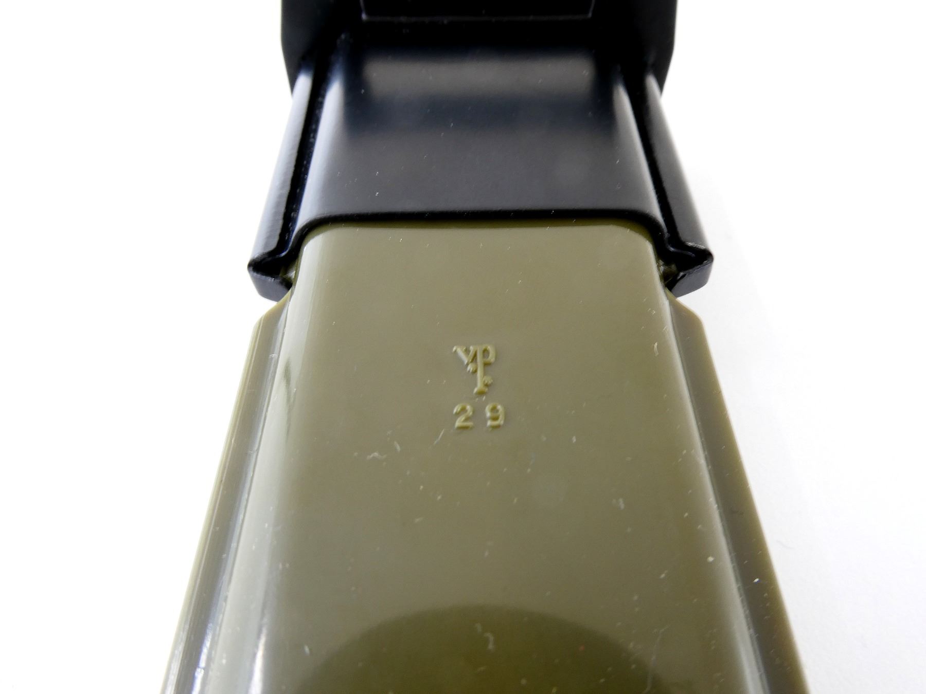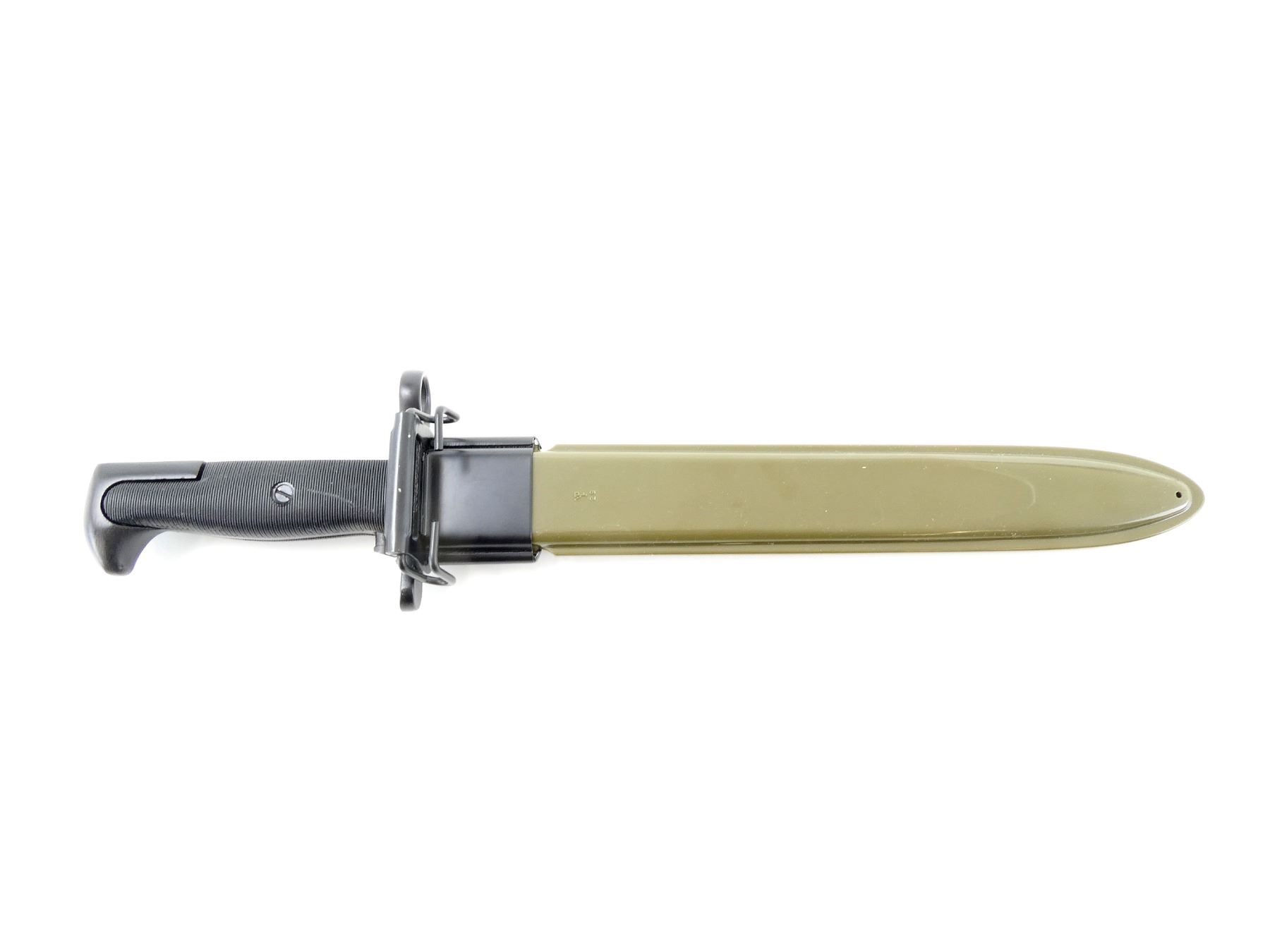 (1) NOS, OPENED FOR PICTURES, FITS .30-06 M1, M1903 & M1903A3 RIFLES, RICASSO MARKED: "U.F.H" OVER "U.", ORDNANCE BOMB, "S.", BLACK POLYMER GRIP, METAL POMMEL, NO VISIBLE MARKINGS, M1 GARAND GREEN POLYMER SCABBARD WITH METAL BELT HOOKS, MARKED: "U.S." INSIDE ORDNANCE BOMB & "VP (VICTORY PLASTICS)" OVER "29", BLADE APPROX. 9 7/8" & OAL APPROX. 14.5". SEE PHOTOS.