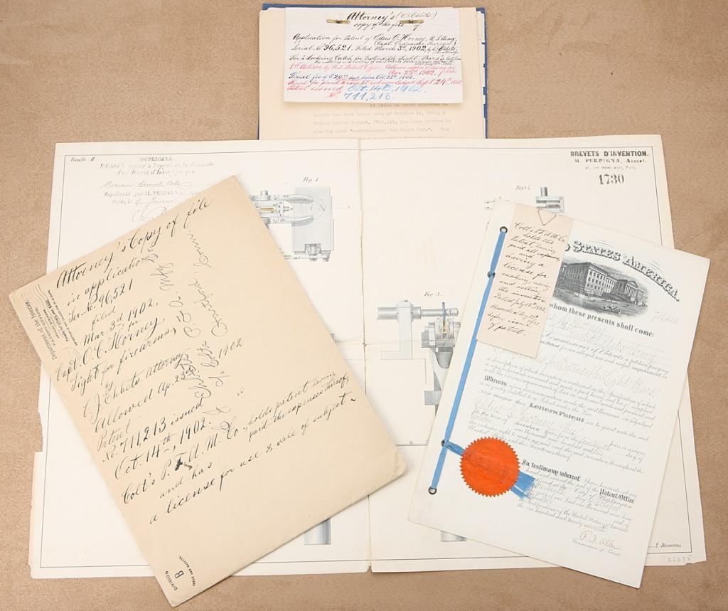 U.S. Dept. of Interior Patent Office original attorney’s file copy of documents for Colt Firearm’s attorney C.J. Ehbets regarding the issuance of Patent No. 711,213 issued Oct. 14, 1902, for a locking catch for anextendible sight bars for the Gatling Gun. The packet is contained in a U.S. Dept. of Interior Patent Office envelop and includes the signed and red sealed patent, a fold out diagram of the apparatus and a packet ofcorrespondence and documents related to the application for patent, review and approval. A rare opportunity to have an original packet of firearms-related patent documents; formerly in the estate of Charles T. Haven,early firearms author and collector. Est.: $350-$700.
