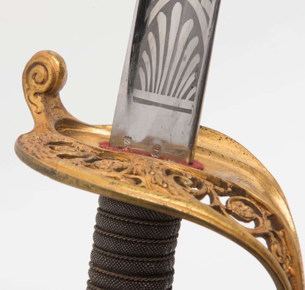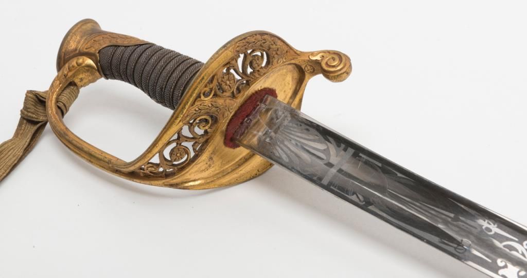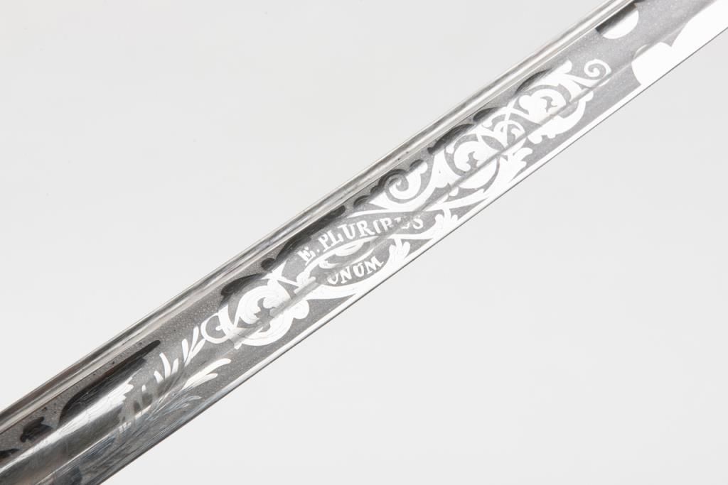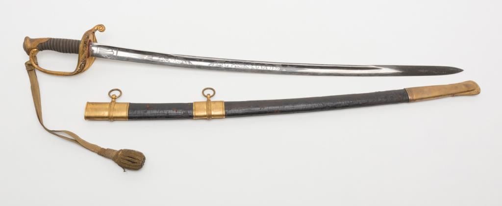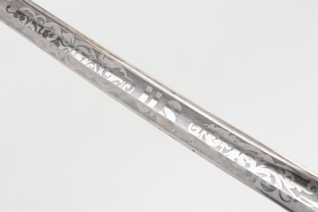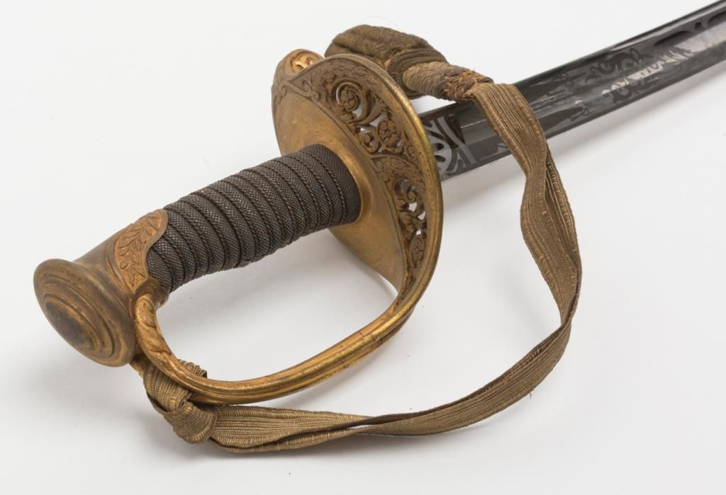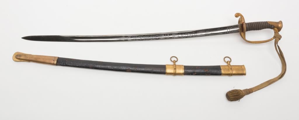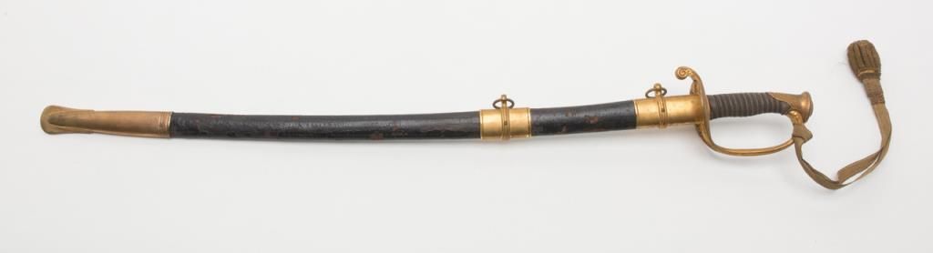 U.S. Dress sword and leather covered scabbard; un-marked etched blade is in overall very good to near fine condition; the brass guard and wire wrapped rayskin grip is also very good to near fine with accompanying braided hanger and knot.The scabbard leather shows some scattered cracking and losses but is overall fair to good with good mountings. Est.: $300-$500.