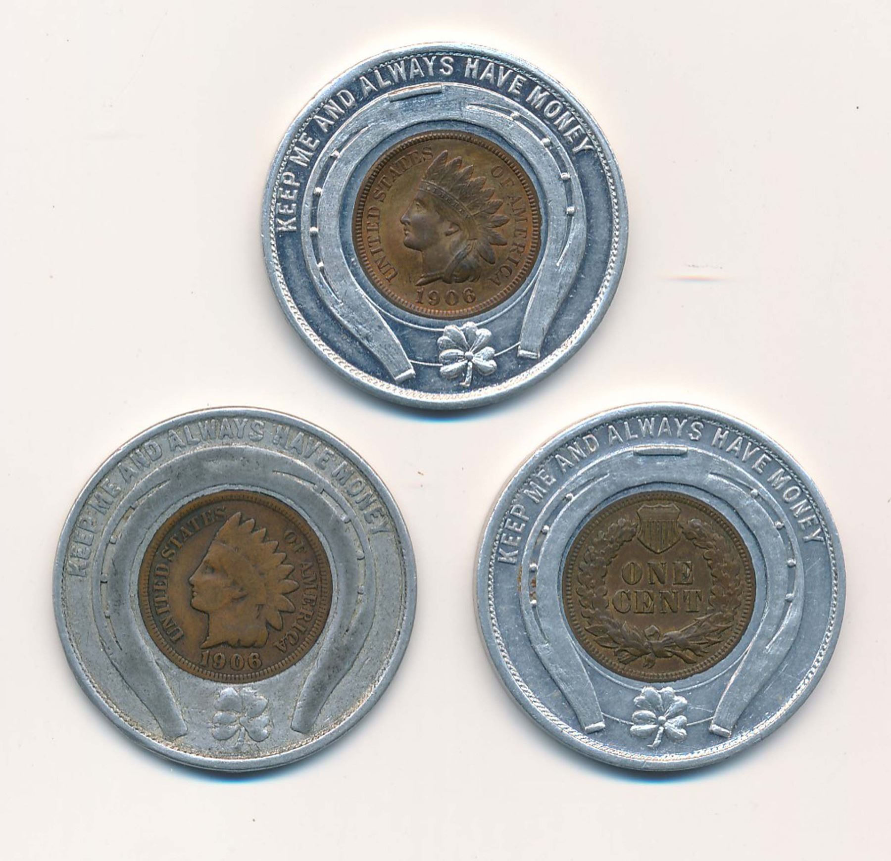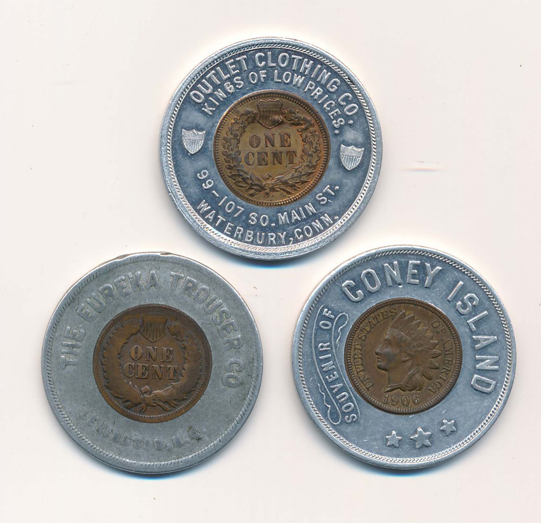 Coney Island Souvenir Very Fine+, The Eureka Trouser Co., Lexington, N.C. in Very Good, and Outlet Clothing Co., Waterbury, Conn. in Extra Fine (original lustre on the Cent)