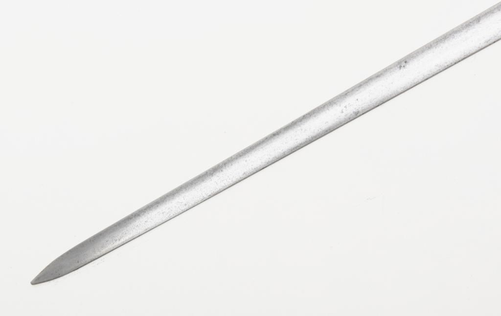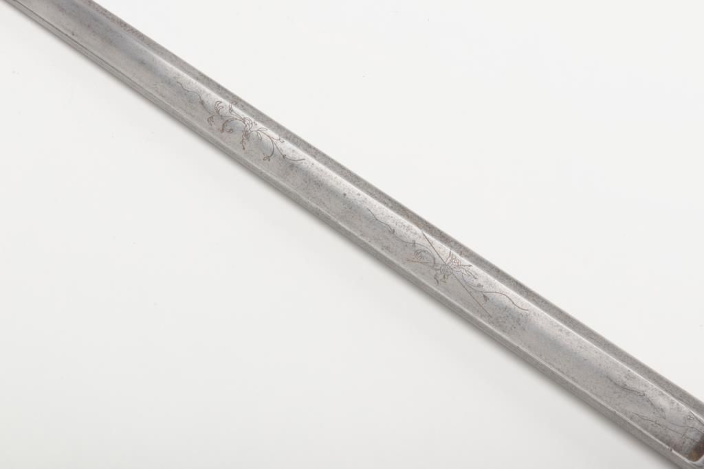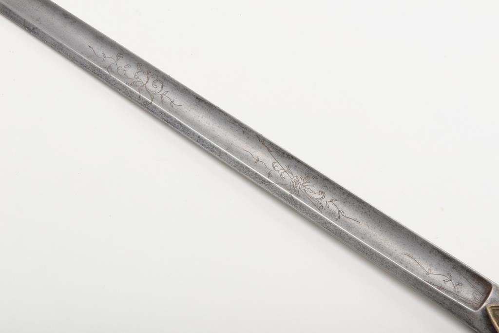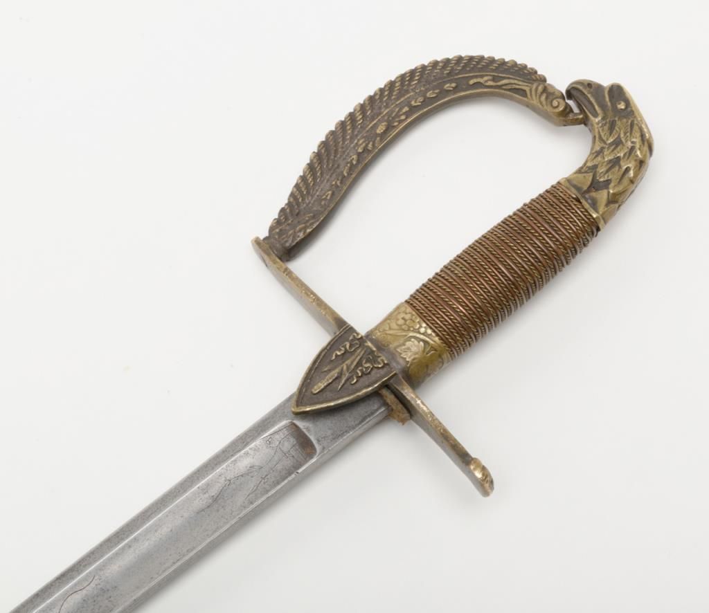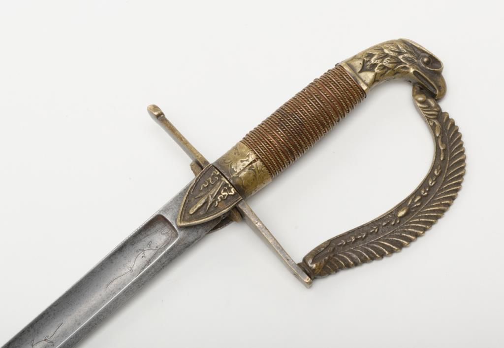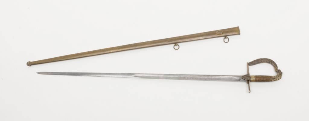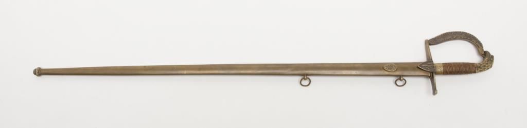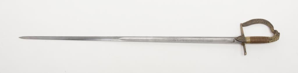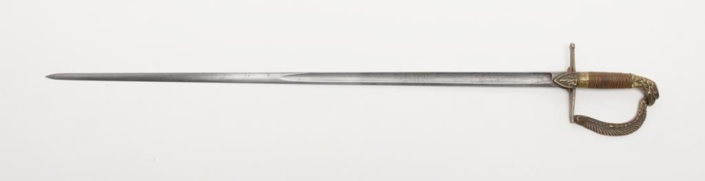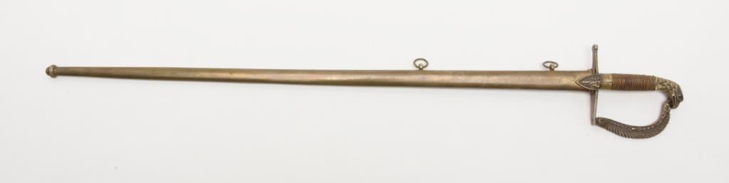 U.S. Eagle head officer’s sword probably French made and imported for militia use circa 1825-1840s. The sword retains its original scabbard and is in good condition showing a gray patina on the blade with some normal aging andgood engraving. The scabbard shows traces of gold gilt and just a couple of minor nicks and no large dents. The grip is wire wrapped and the shape of the knucklebow on the guard is somewhat unusual. The feral between the grip and hilt shows a small split. Est.: $500-$1,000