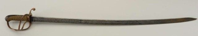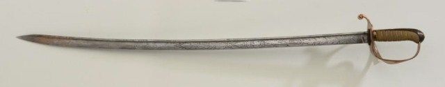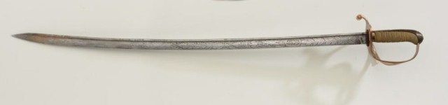 U.S. Engineers style sword by W.H. Horstmann & Sons of Philadelphia with brass three (3) branch guard showing star on thumb piece and single wire wrap over ray-skin grip. The blade is nicely etched with eagles, florals,Indian and tent flying flag. The blade shows some light to moderate pitting and erosion. The hilt shows a plated finish that has turned yellow-copper color and the grip is very good. No scabbard circa Mexican war toCivil war. Est.; $400- $800