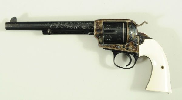 7 1/2'' Barrel, Ivory grip, blue finish. Top is engraved, "El Malo" and "Caballero De Tejas". Back of handle is engraved "Texas". Serial # - 20957