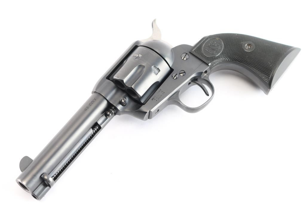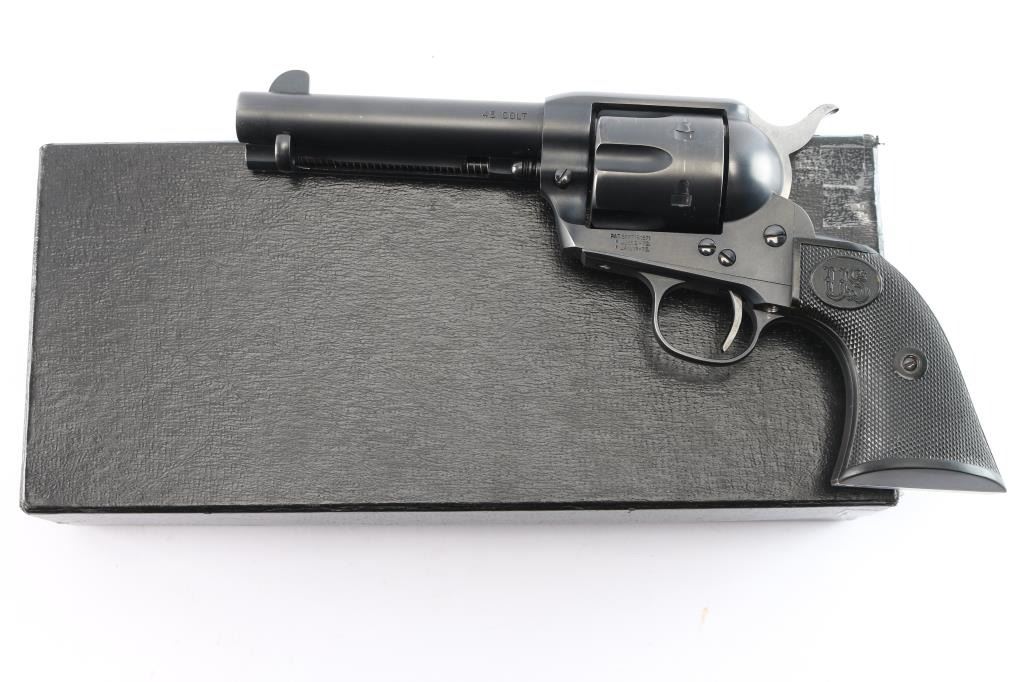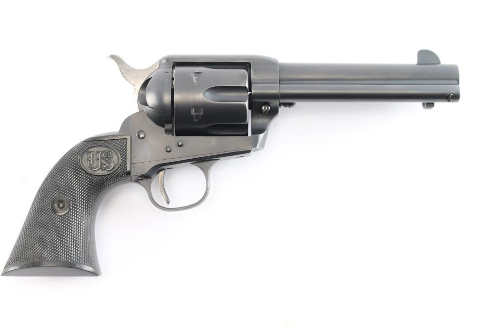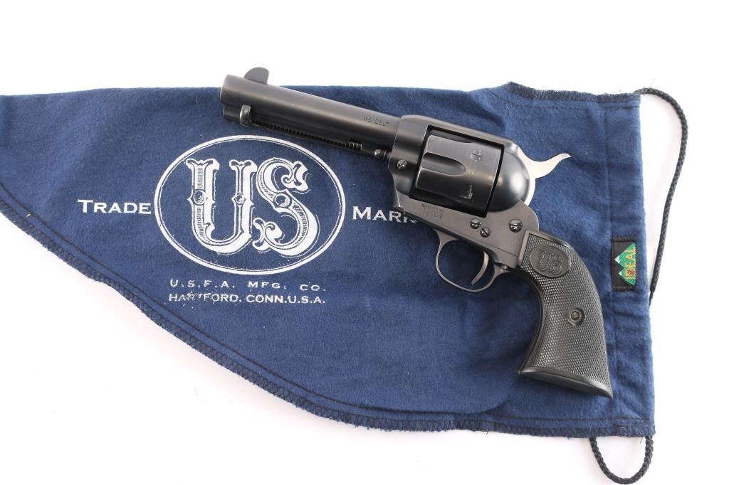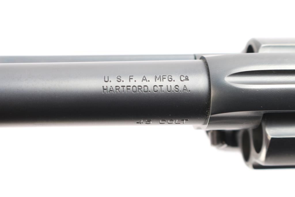 Exceptional single-action revolver chambered in .45 LC Winchester, produced by United States Fire Arms Mfg. Co. based out of The Colt Armory complex in Hartford, Connecticut. The company is renowned for their superb quality and finish but went out of business in 2011. This revolver features blued finish, 4 3/4" barrel, blade front sight, 'v' notched rear sight, crescent ejector, fluted six-shot cylinder, black powder patent dated, high polish blued hammer with polished sides, 1st gen spur checkering, cylinder pin retaining screw, and checkered hard rubber two-piece grips with "US" motifs. The barrel is marked with the two line USFA address on the top, caliber on left barrel. Bore is very good/bright, strong rifling. Retains approximately 97% of it's original matte blue finish showing slight muzzle/edge wear, light track line on the cylinder. Grips are excellent. Action is smooth with tight lock up. The screw heads are finished in bright nitre blue. Includes vintage styled black cardboard factory box with paperwork, two corners of the lid are taped/ Matching serial number on frame and cylinder.