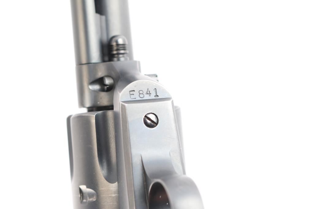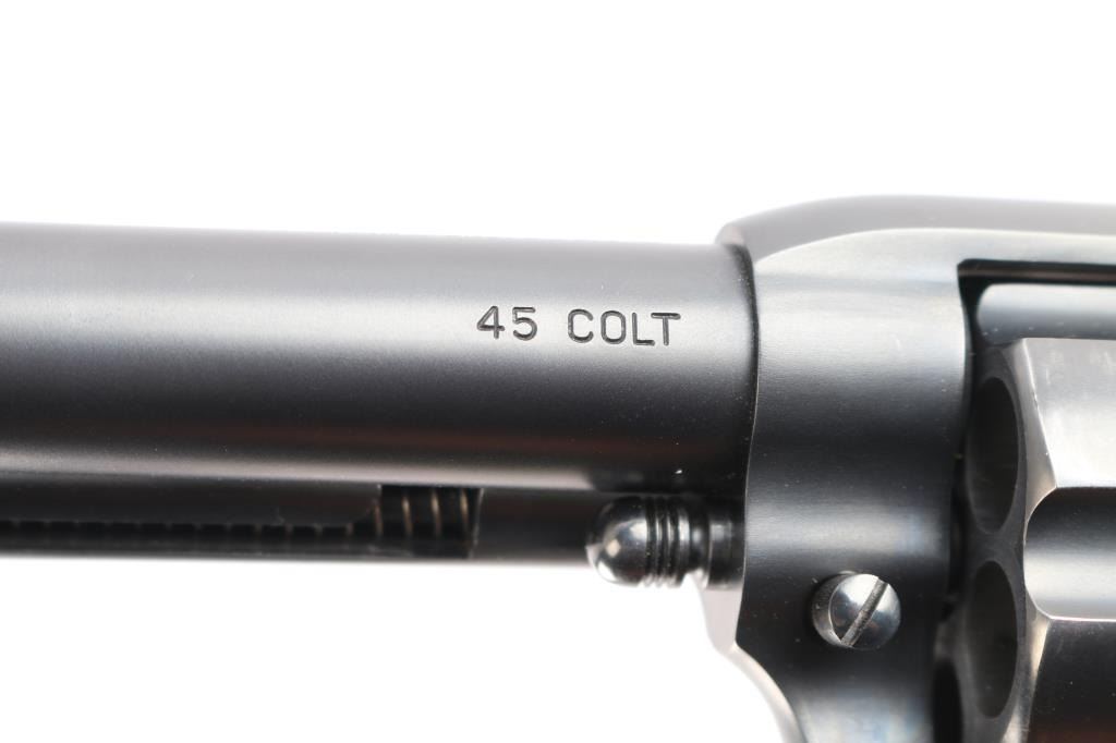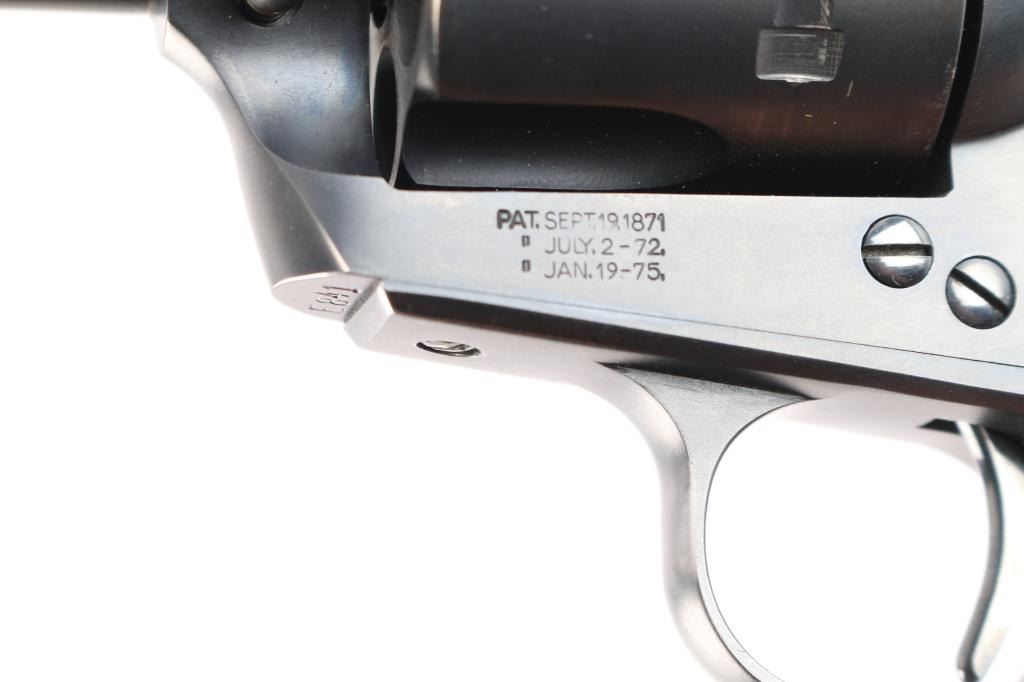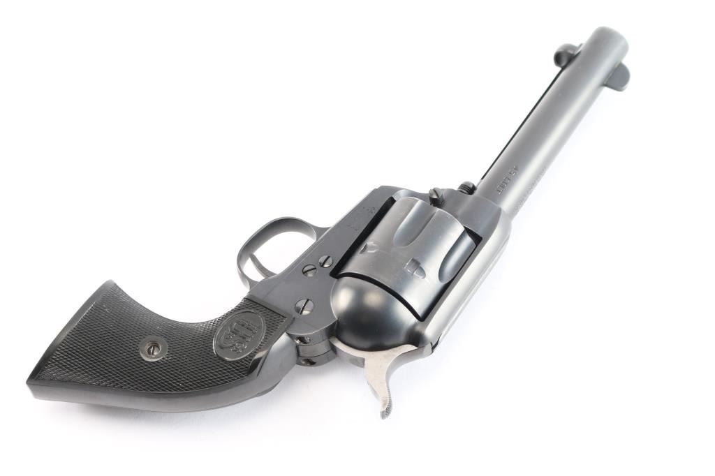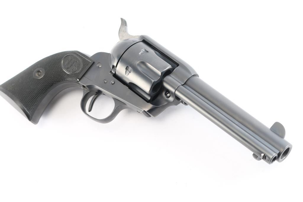 Exceptional single-action revolver chambered in .45 LC Winchester, produced by United States Fire Arms Mfg. Co. based out of The Colt Armory complex in Hartford, Connecticut. The company is renowned for their superb quality and finish but went out of business in 2011. This revolver features blued finish, 4 3/4" barrel, blade front sight, 'v' notched rear sight, crescent ejector, fluted six-shot cylinder, black powder patent dated, high polish blued hammer with polished sides, 1st gen spur checkering, cylinder pin retaining screw, and checkered hard rubber two-piece grips with "US" motifs. The barrel is marked with the two line USFA address on the top, caliber on left barrel. Bore is very good/bright, strong rifling. Retains approximately 97% of it's original matte blue finish showing slight muzzle/edge wear, light track line on the cylinder. Grips are excellent. Action is smooth with tight lock up. The screw heads are finished in bright nitre blue. Includes vintage styled black cardboard factory box with paperwork, two corners of the lid are taped/ Matching serial number on frame and cylinder.