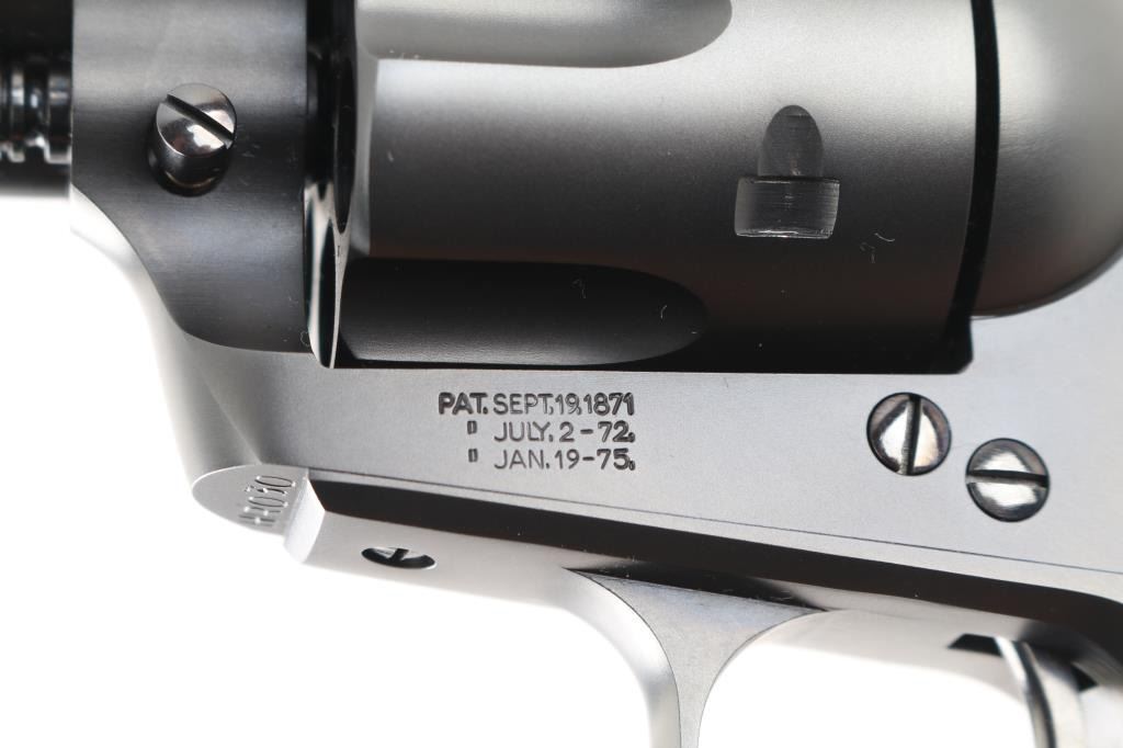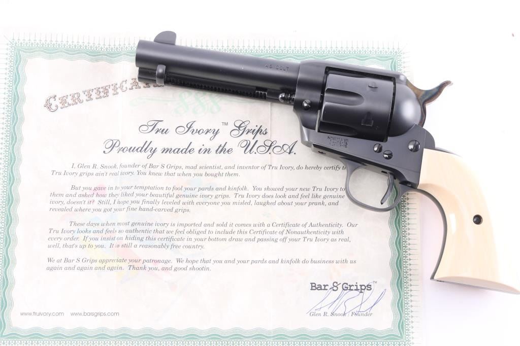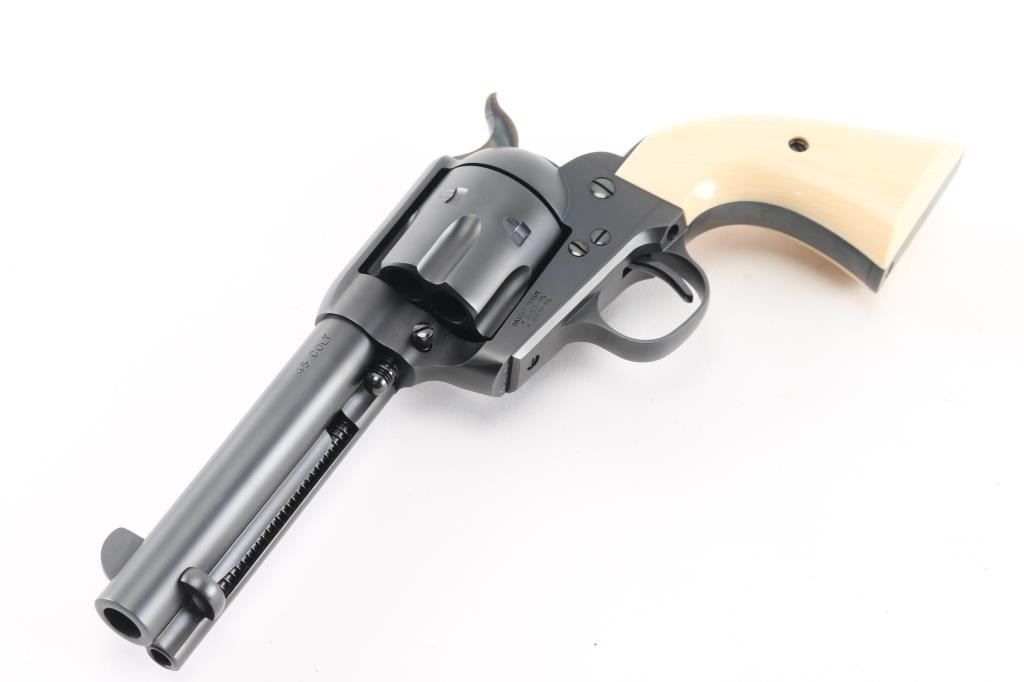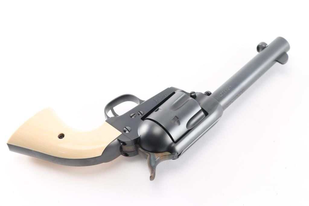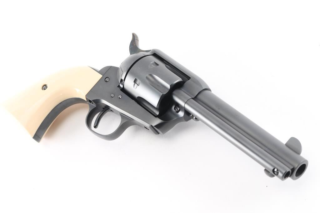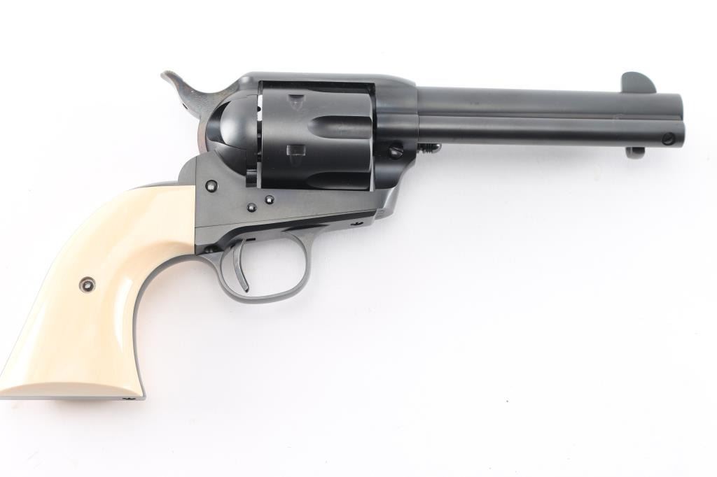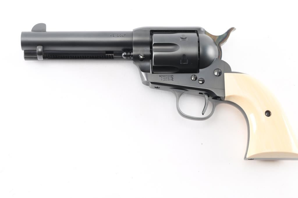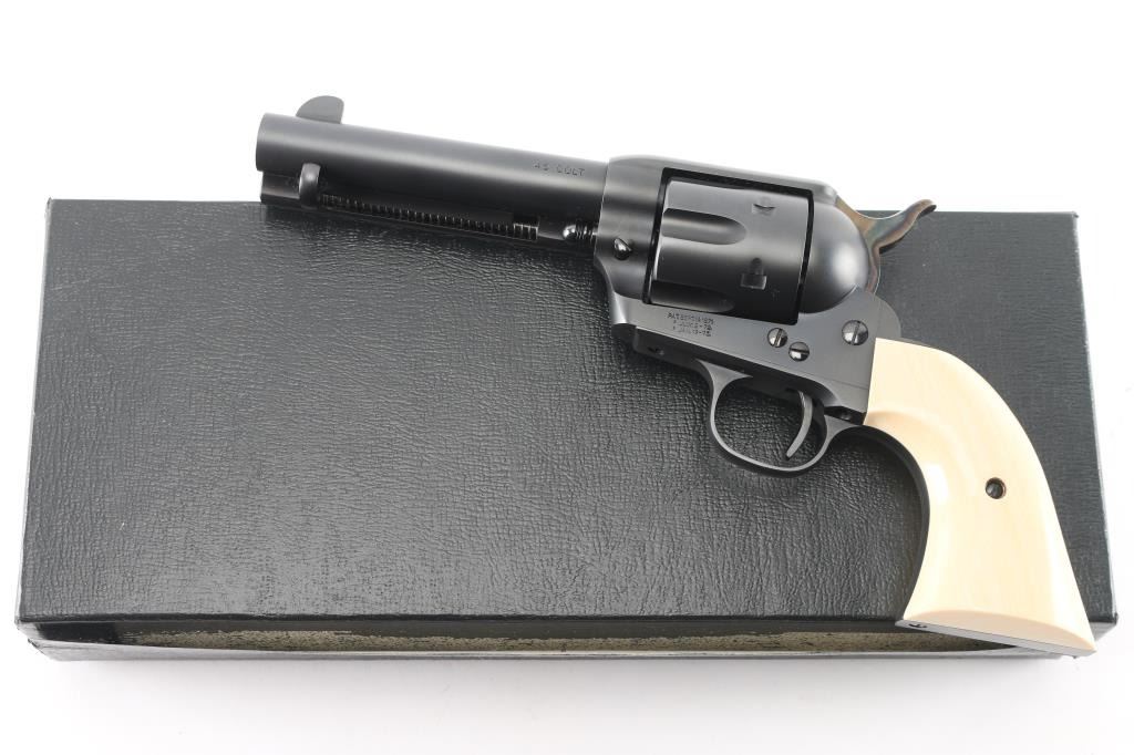 Exceptional single-action revolver chambered in .45 Colt, produced by United States Fire Arms Mfg. Co. based out of The Colt Armory complex in Hartford, Connecticut. The company is renowned for their superb quality and finish but went out of business in 2011. This revolver features matte blued finish, 4.75" barrel, blade front sight, v notched rear sight, fluted six-shot cylinder, and smooth two piece faux ivory grips. Barrel is marked with the two line USFA address on the top. Bore and charge holes are pristine. Retains approx 99% of its original finish showing hardly any signs of handling. Case colors on hammer are excellent with fiery colors. "Tru Ivory" grip by Bar-S Grips are excellent, with their "Certificate of Nonauthenticity". Action is smooth with tight lock up. Includes black cardboard factory box with paperwork, factory cloth bag.Condition is NRA Excellent - like new*** Modern Firearm ***