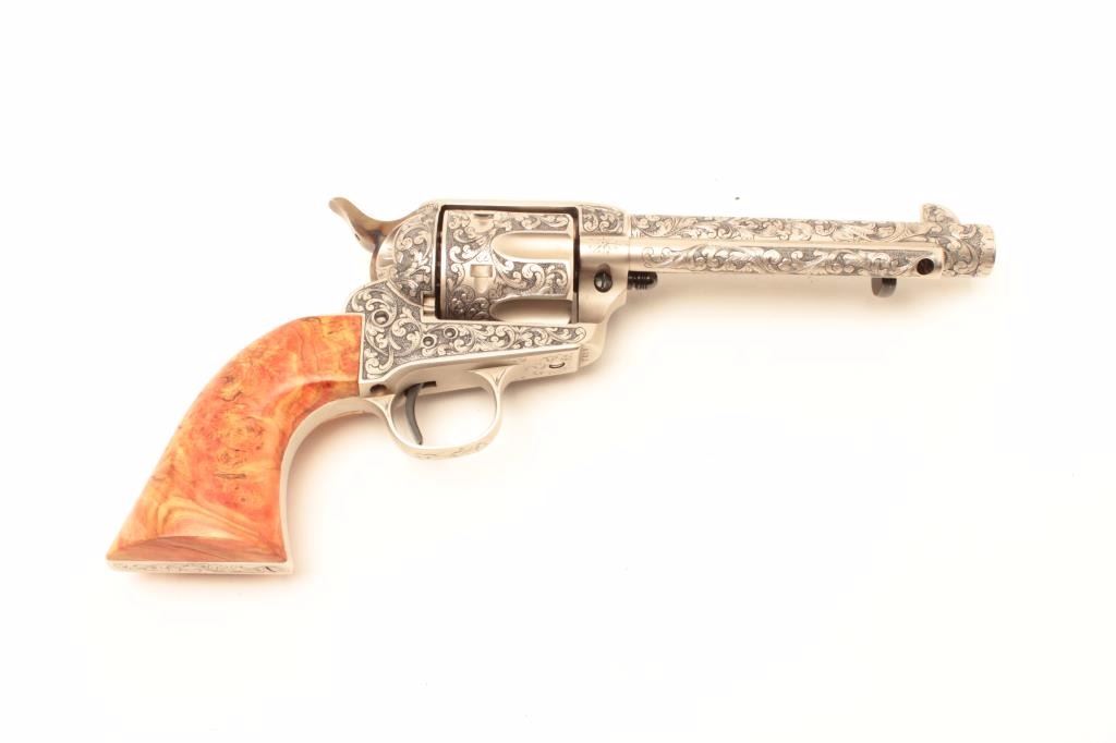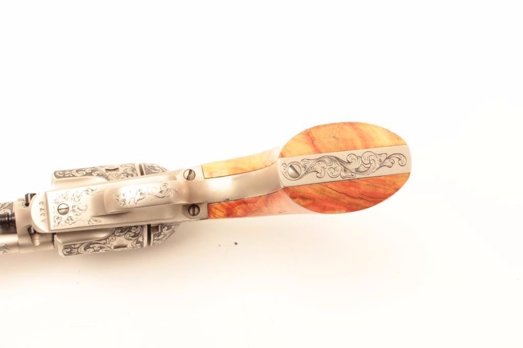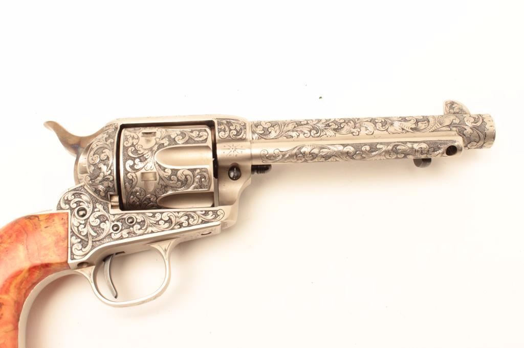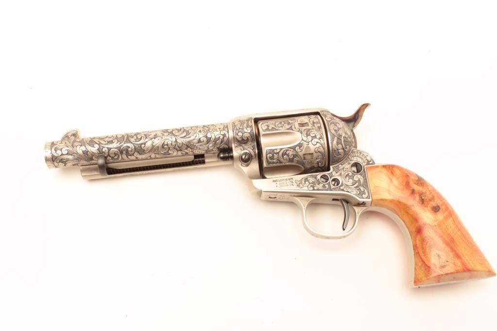 U.S. Firearms Mfg. Co. copy of a Colt SAA revolver, expertly and extensively engraved by Aarron Pursley of Big Sandy, MT., .45 caliber, 5.5” barrel, exotic wood grips, S/N A373, in overall excellent condition showinglittle use or handling. (Modern/No PPT). Est.: $600-$1,200.
