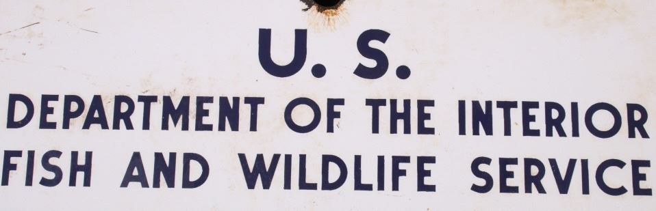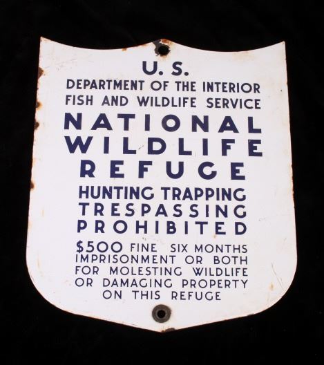 Featured in this lot is a U.S. Fish and Wildlife Service Porcelain Enamel Sign, from the U.S. Department of the Interior. The sign is also marked "National Wildlife Refuge / Hunting Trapping Trespassing Prohibited / $500 Fine Six Months Imprisonment or Both For Molesting Wildlife or Damaging Property on This Refuge." The sign is in good condition with some rust and wear showing. It measures 15.25" x 13".