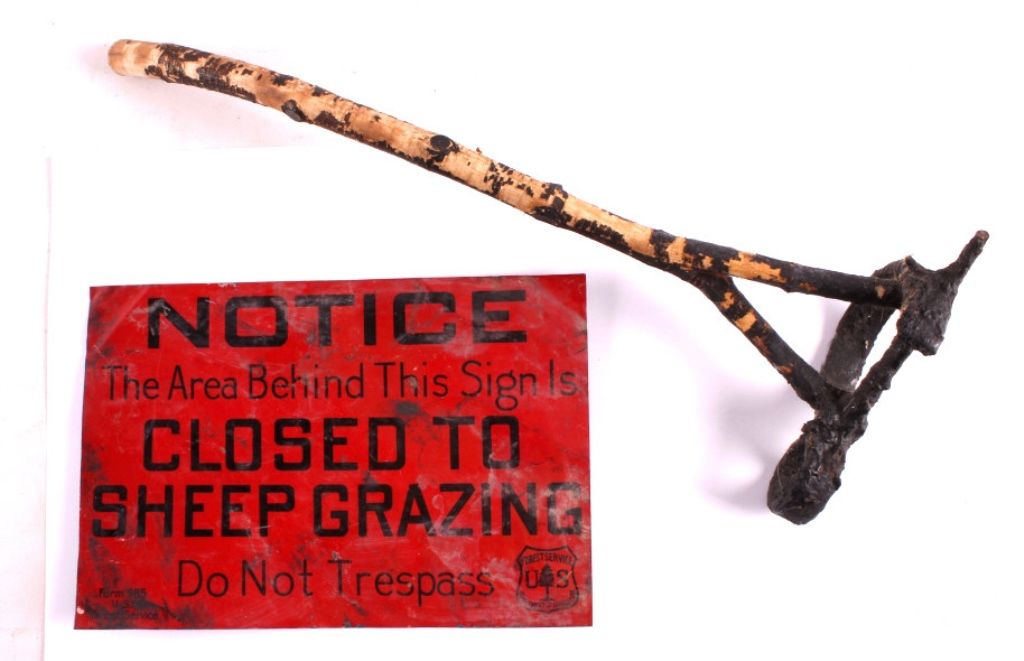 This is a U.S. Forest Service sign and sheep brand. The sign was used to give notice of land closure for sheep grazing. The sheep brand is used like a stamp to brand the animal unlike the hot iron method used for cattle. The sign and brand are in good condition. The brand measures 6" x 16" and the sign is 6.75" x 10".