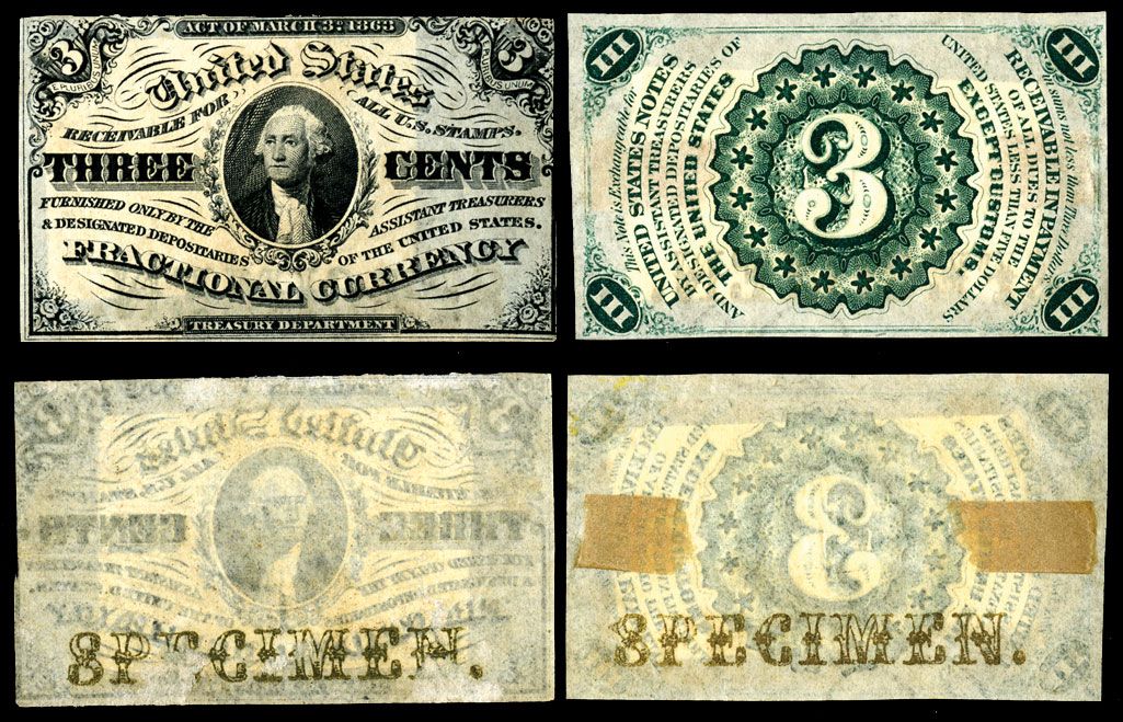 U.S. Fractional Currency, Third Issue, 3 Cents, Uniface Narrow Margin Face & Back Specimen, Fr.1227-