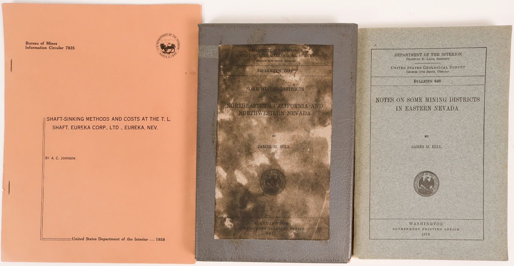 U.S.G.S. Nevada Mining Reports (Part 4) (3) Bulletin 648, 594 and Bureau of Mines Circular 7835 1) Bulletin 648 - Notes on some MIning Districts in Eastern Nevada 1916: (6 x9" booklet - 6 Plates, 18 Figures -214 Pages) 2) Bulletin 594-Some Mining Districts in North Eastern California & Northwestern Nevada-1915 (6 x9" HB -18 Plates, 4 Figures -200 Pages) 3) Bureau of Mines Circular 7835: "Shaft -Sinking Methods and Costs at the T.L. Shaft, Eureka Corp., Ltd, Eureka, Nev. , by A.C. Johnson, United States Department of the Interior