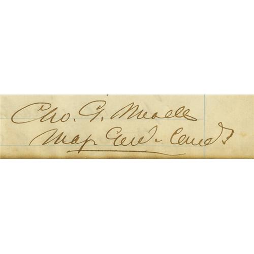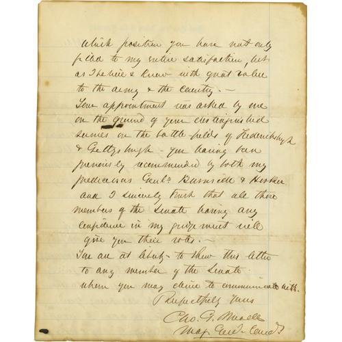 <B>U.S. General George Meade War Date Autograph Letter Signed</B></I> "<I>Geo. G. Meade</B></I>". Two pages (front and verso of one sheet), 7.75" x 9.75" lined "Head-Quarters, Army of the Potomac" letterhead, Culpeper, Virginia , March 15, 1864, to "<I>Maj. Genl. Humphreys Chief of Staff</B></I>." Meade writes a letter of recommendation for Humphreys after hearing that his nomination to major general was in jeopardy because of opposition in the senate, in part: "<I>I have learned with great surprise & regret, that owing to certain false & slanderous reports, circulated by a subordinate officer, where in the discharge of your duties, you were compelled to have tried & dismissed the service that your confirmation by the Senate has been jeopardised. This due to truth & the relations existing between us that I should say I desire most earnestly your confirmation for the reason, that contrary to your inclinations, you gave up the command of a division thereby sacrificing your personal interests in order to accept the position of Chief of my staff which position you have not only filled to my entire satisfaction, but as I believe & know with great value to the army & the county... You are at liberty to shew this letter to any member of the Senate whom you may desire to communicate with...</B></I>" The nomination was eventually approved, and Humphreys was promoted to major general of volunteers on July 8, 1863, likely in some part due to this powerful letter from Meade. Humphreys' most ardent desire was a field command, but he accepted the position as Meade's chief of staff in order to get the promotion he felt he deserved, thus Meade's comment of "<I>...sacrificing your personal interests...</B></I>" Some age toning to edges and light general soiling, else very good.<BR><BR><b>Shipping:</b> Flat Material, Small (<a target="_blank" href="http://www.heritageauctions.com/common/shipping.php">view shipping information</a>)