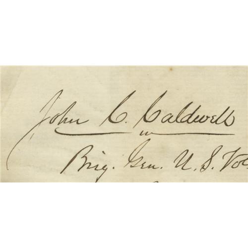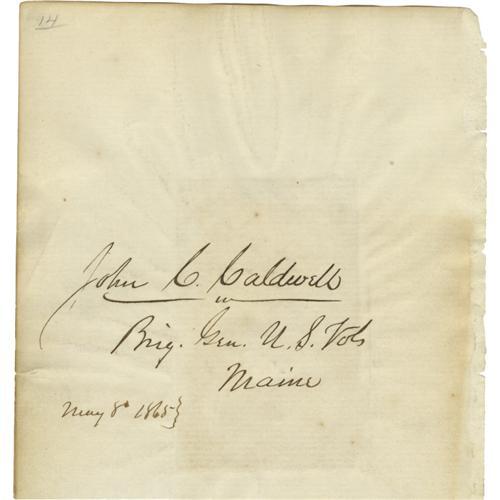 <B>U.S. General John C. Caldwell Signature</B></I> on a 5.5" x 5.75" sheet with added "<I>Brig. Gen. U.S. Vols / Maine / May 8, 1865</B></I>". Caldwell, even without any military experience, was elected colonel of the Maine 11th Infantry regiment in November, 1861 and then promoted to brigadier general in April, 1862 and placed in command of the 1st Brigade of the 1st Division of II Corps of the Army of the Potomac. After the war, he spent 40 years as a U.S. diplomat. Fine condition with light crinkling and toning.<BR><BR><b>Shipping:</b> Miscellaneous Collectibles, Smal (<a target="_blank" href="http://www.heritageauctions.com/common/shipping.php">view shipping information</a>)
