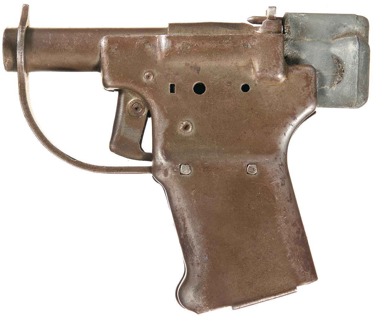 Produced from 1942-1945 by the Guide Lamp Division of General Motors, the Liberator was issued the nomenclature "Flare Pistol, 45 Caliber" in order to obscure its true purpose; to be airdropped in occupied territories and be used by disgruntled citizens and resistance fighters to eliminate a German soldier and steal his weapon. Designed with cost first in mind, the roughness of the weapon is little penalty if it is used properly; on a lone, unaware target, at very close range, preferably in the dark. This is a three hole model that was made from sheet metal stampings that were spot welded together on top of the smooth bore barrel, and fitted with a cast zinc cocking knob with integral guide pin. The grip is hollow to store additional rounds, but the cover is absent.