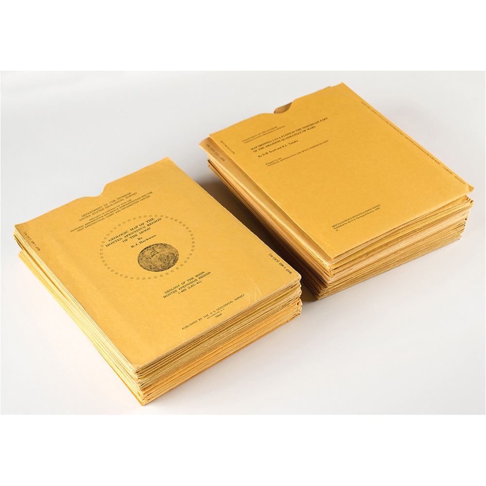 Fantastic collection of 61 geological maps of the Moon and Mars, published by the U. S. Geological Survey between 1962 and 1982, and prepared in cooperation with NASA and the USAF Aeronautical Chart and Information Center. The collection contains a total of 49 different lunar maps and 12 different Martian maps. The majority of the lunar maps, which measure between 41.75 x 31.75 and 52.5 x 26.5, are 1:1,000,000 scale and include meticulous geologic studies of sundry regions and quadrangles of the moon‰Ûªs surface. The Martian maps, which measure between 47 x 29.5 and 54.5 x 38, are mostly 1:2,000,000 scale (one being 1:5,000,000), and they all derive from the Miscellaneous Investigations Series, focusing mostly on the location of lava flows in brilliant color. The maps are listed in order by their production number.