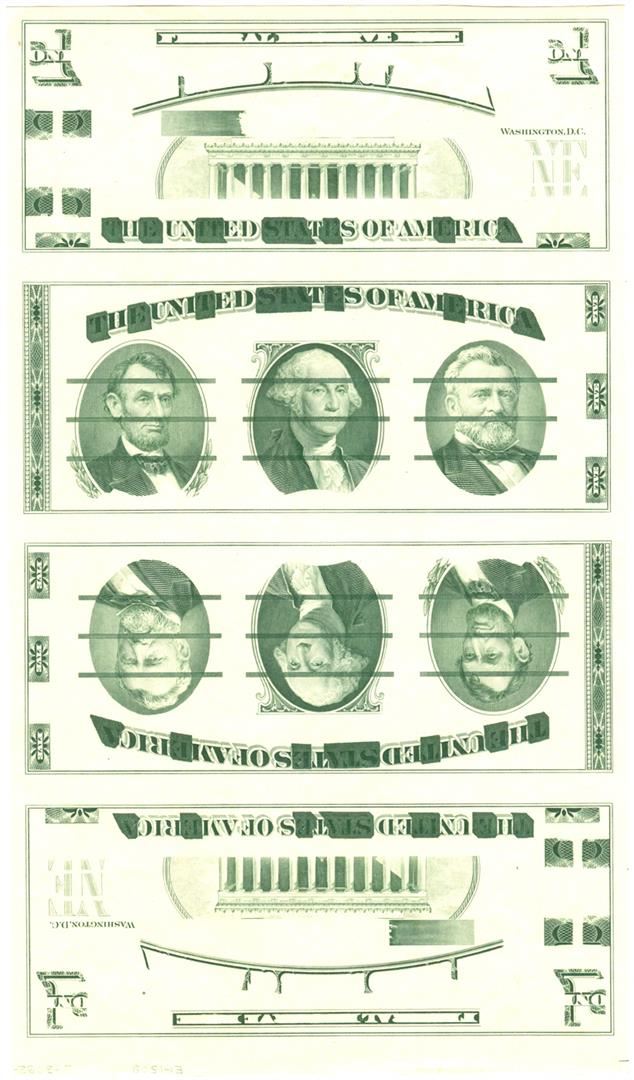 Rare U.S. Giori Test Banknote Uncut Sheet of 4. These were printed in Geneva, New York to evaluate the printing quality. The BEP released "nonsense" plates composed of cancelled portions of printing plates from various denominations. This uncut sheet of 4 features the $1 and $5 denominations.