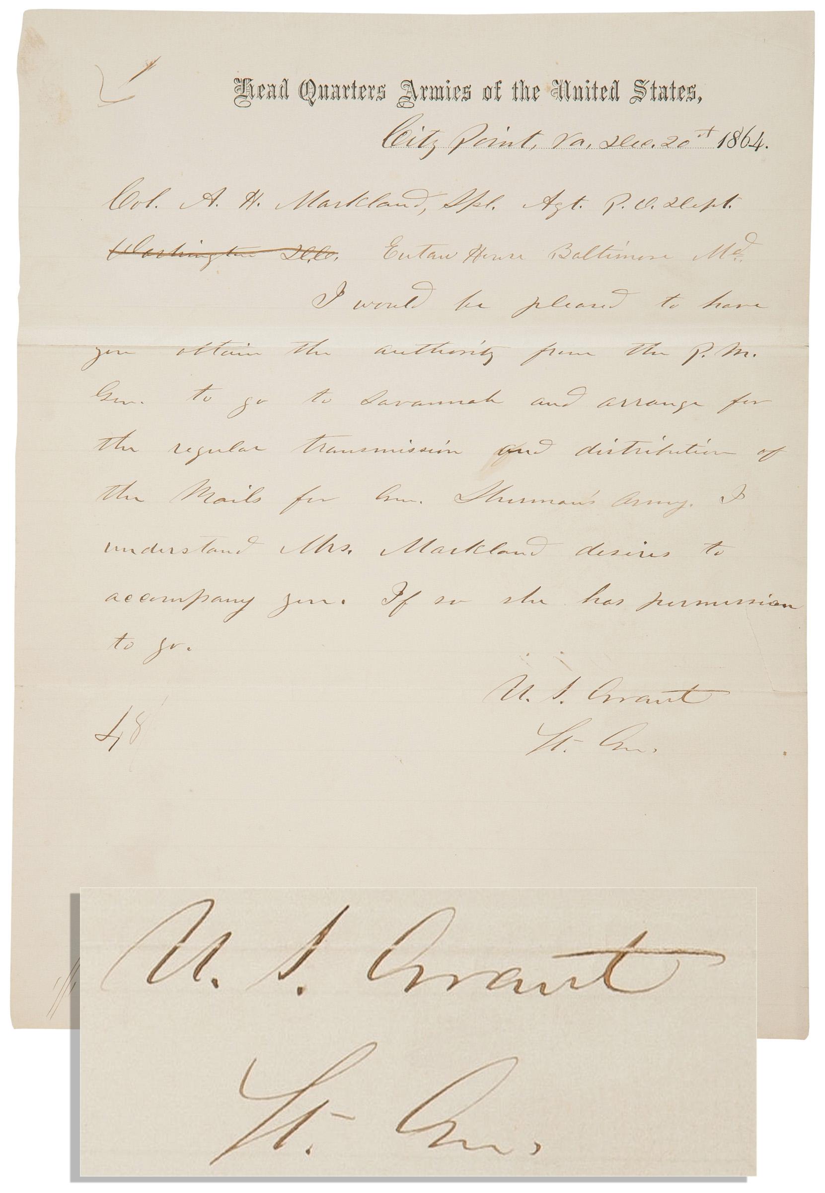 General Ulysses S. Grant autograph letter signed from City Point, Virginia, dated 20 December 1864 on ''Head Quarters Armies of the United States'' letterhead. Written from his cabin headquarters at City Point during the Siege of Petersburg, Grant orders Colonel Absalom Markland (assigned to Grant's staff as a special agent of the Post Office Department), to get mail to General Sherman in Georgia during the Siege. Letter reads: ''I would be pleased to have you obtain the authority from the P[ost] M[aster] Gen. to go to Savannah and arrange for the regular transmission and distribution of the mails for Gen. Sherman's Army. I understand Mrs. Markland desires to accompany you. If so she has permission to go.'' Signed ''U. S. Grant / Lt. Gen.'' Letter measures 7.75'' x 10'' on one page with toning, some separations and one minor tear at folds. Very good.