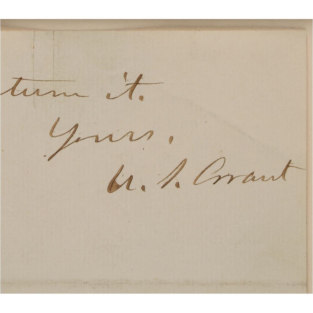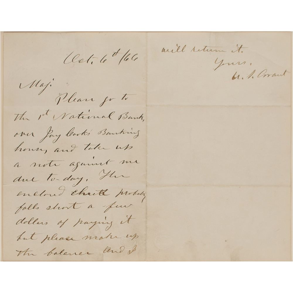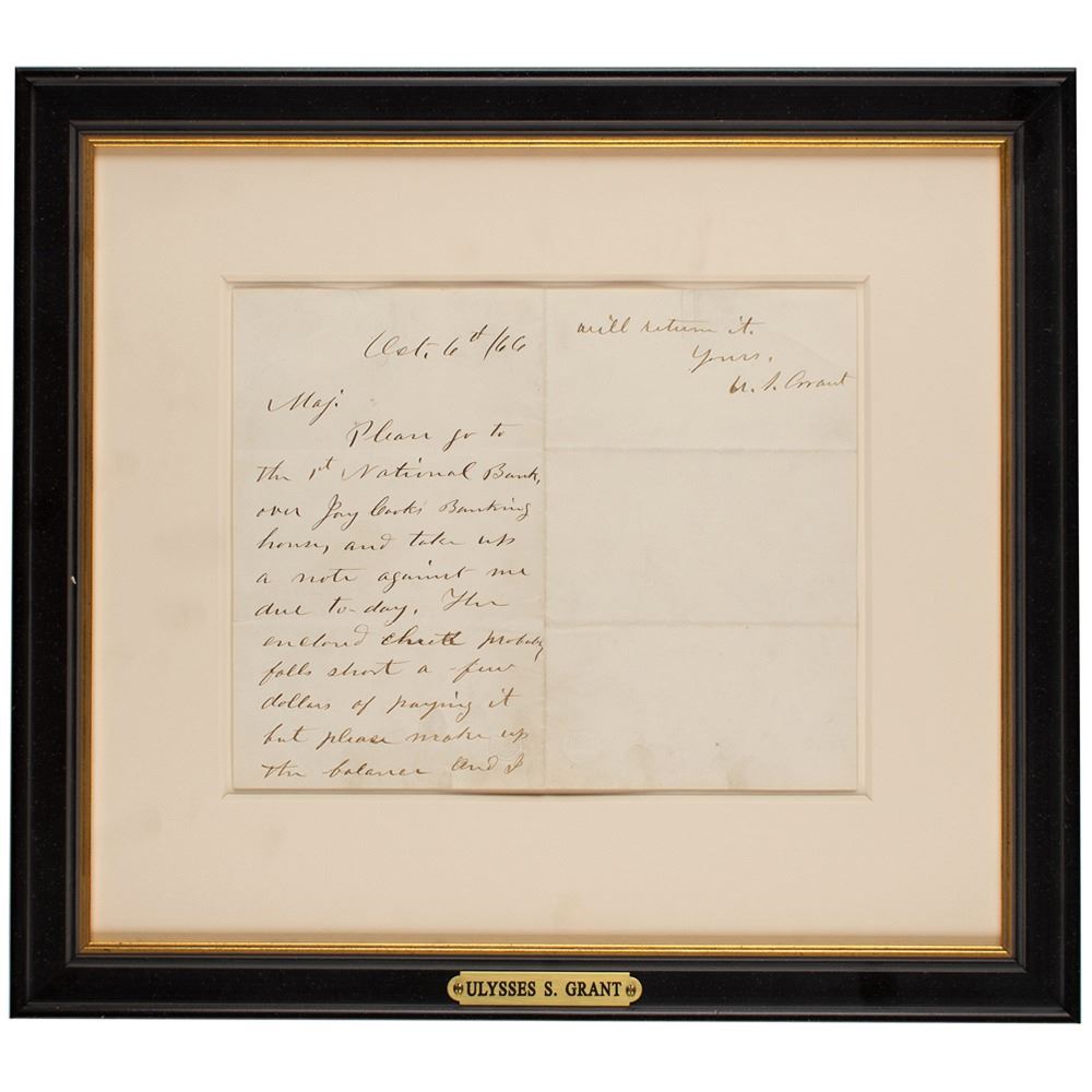 ALS, two pages on two adjoining sheets, 4.75 x 7.75, October 6, 1866. Handwritten letter to a major, in full: "Please go to the 1st National Bank, over Jay Cook's Banking House, and take up a note against me due to-day. The enclosed check probably falls short a few dollars of paying it but please make up the balance and I will return it." Mounted, matted, and framed to an overall size of 16.5 x 14.5. In fine condition, with some fingerprint smudges to the bottom edge.