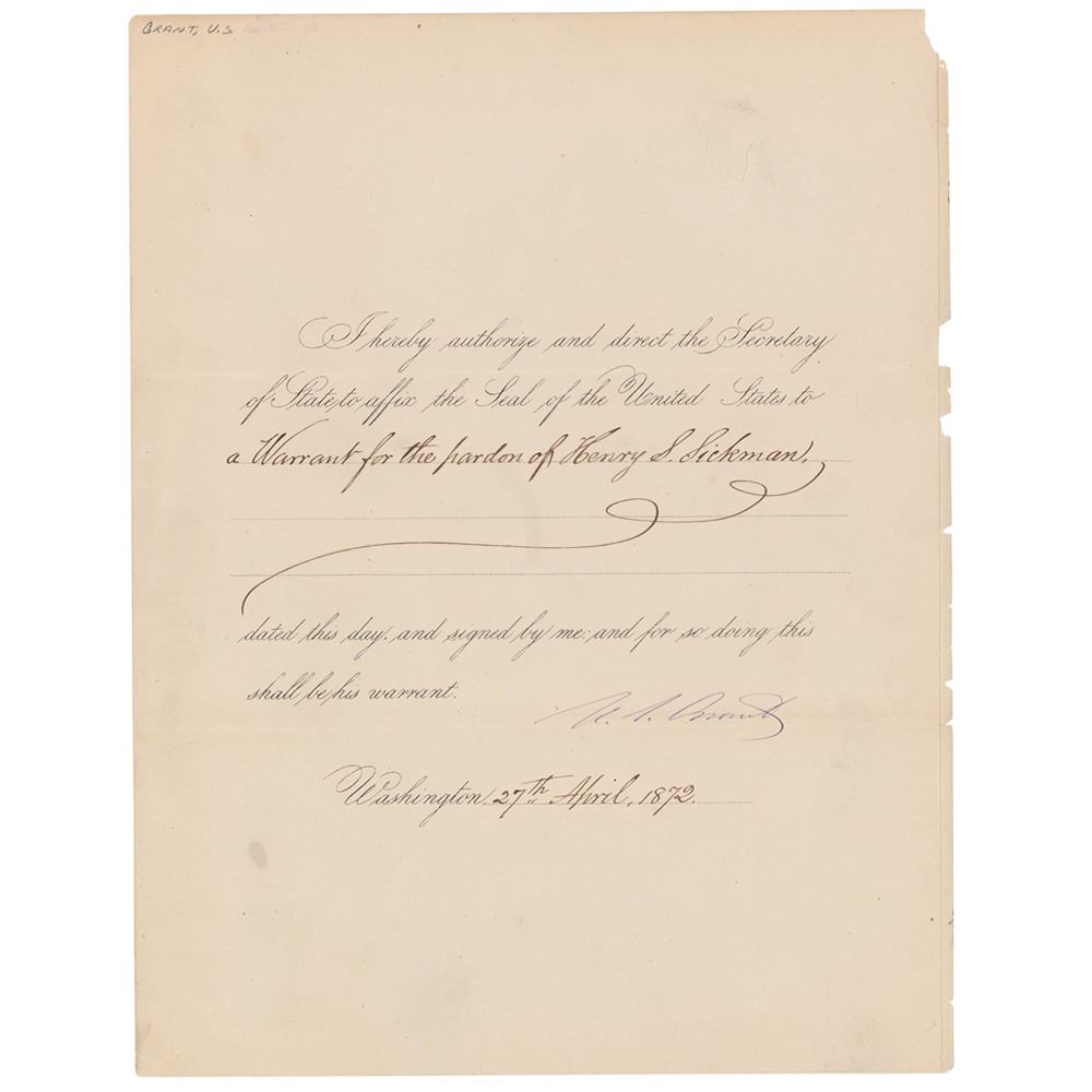 Partly-printed DS as president, one page, 8.5 x 11, April 27, 1872. President Grant directs the Secretary of State to "affix the Seal of the United States to a Warrant for the pardon of Henry S. Sickman." Signed at the conclusion by President U. S. Grant. In very good to fine condition, with some light creasing, and a faint stain to the lower blank area.
