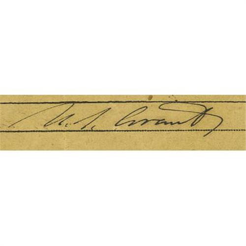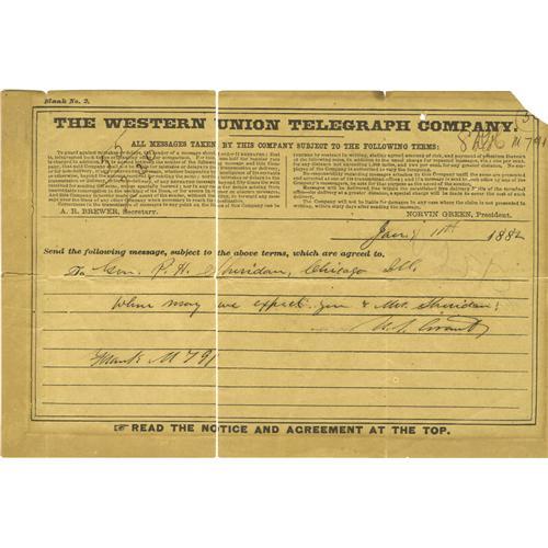 <B>Ulysses S. Grant Handwrites a Telegram to General Phillip H. Sheridan.</B></I> Dated January 11, 1882, Grant inquires as to when he may expect the arrival of General & Mrs. Sheridan. One corner clipped, and one tiny hole. Several fine original fold creases, and measuring 8" x 5.25". A great item associating two of the Civil War's greatest generals.<BR><BR><b>Shipping:</b> Small Flat (<a target="_blank" href="http://www.heritageauctions.com/common/shipping.php">view shipping information</a>)