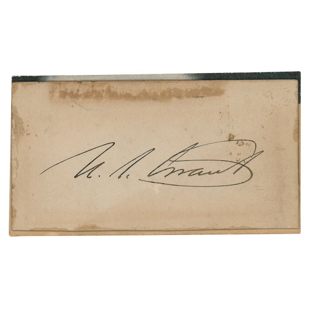 Desirable ink signature, "U. S. Grant,†on an off-white 3.25 x 1.75 card affixed to a slightly larger mount. In very good to fine condition, with irregular toning and edge staining.