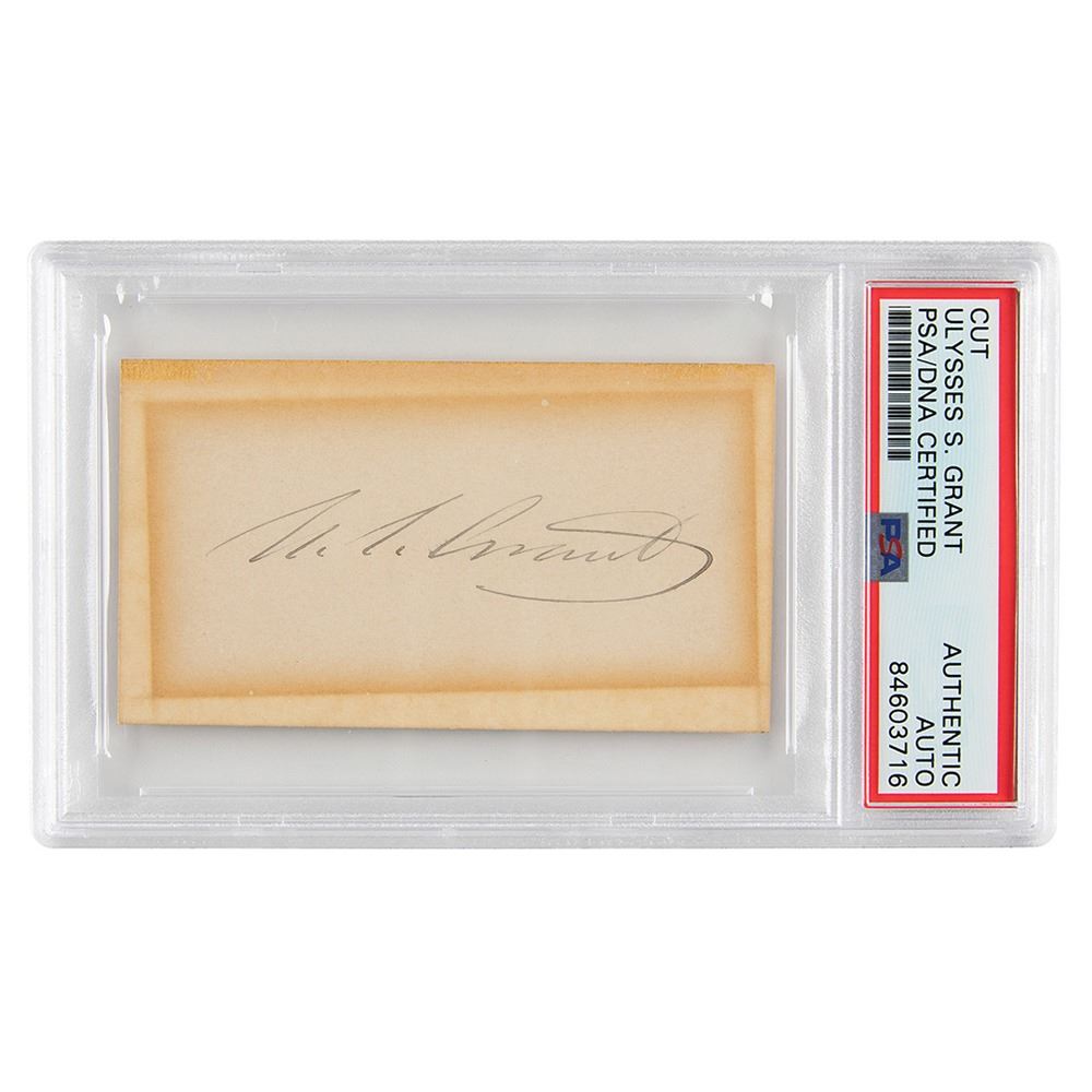 Ink signature, "U. S. Grant,†on an off-white 3.25 x 1.75 card. In fine condition, with toning from prior display. Encapsulated in a PSA/DNA authentication holder.
