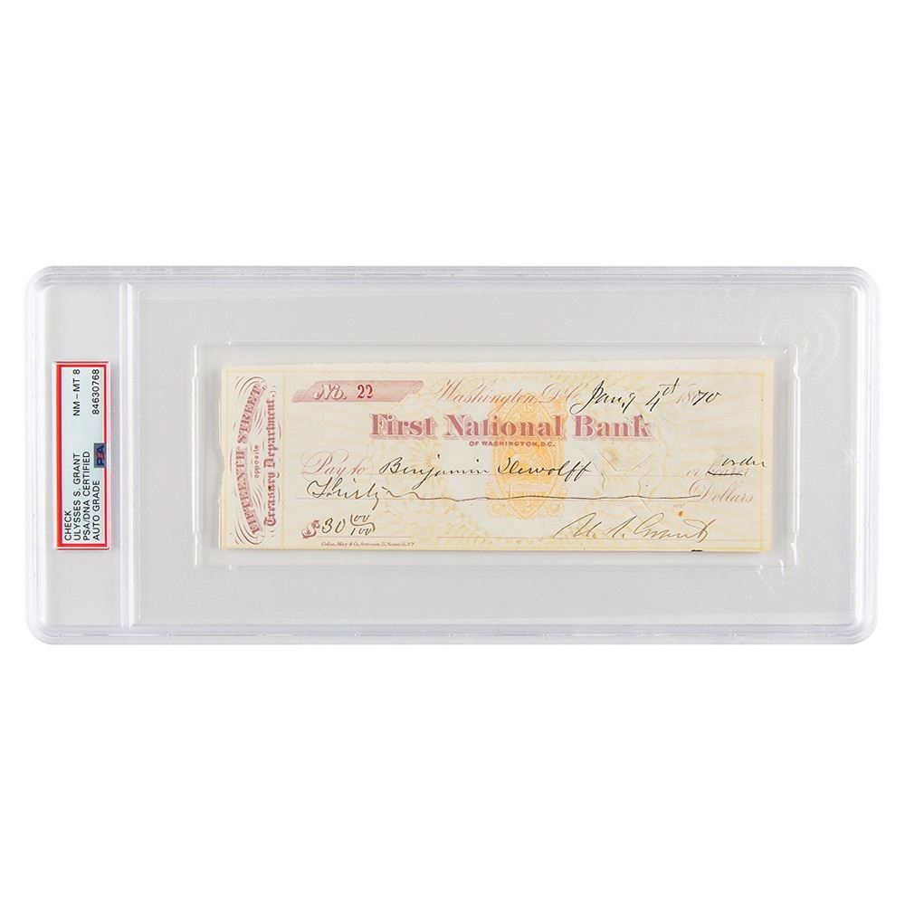 First National Bank business check, 8 x 2.75, filled out and signed by Grant as president, "U. S. Grant," payable to Benjamin DeWolff for $30, January 4, 1870. In fine condition. The recipient is most likely the New York jeweler of the same name. Encapsulated in a PSA/DNA authentication holder, grading the autograph as "NM-MT 8."