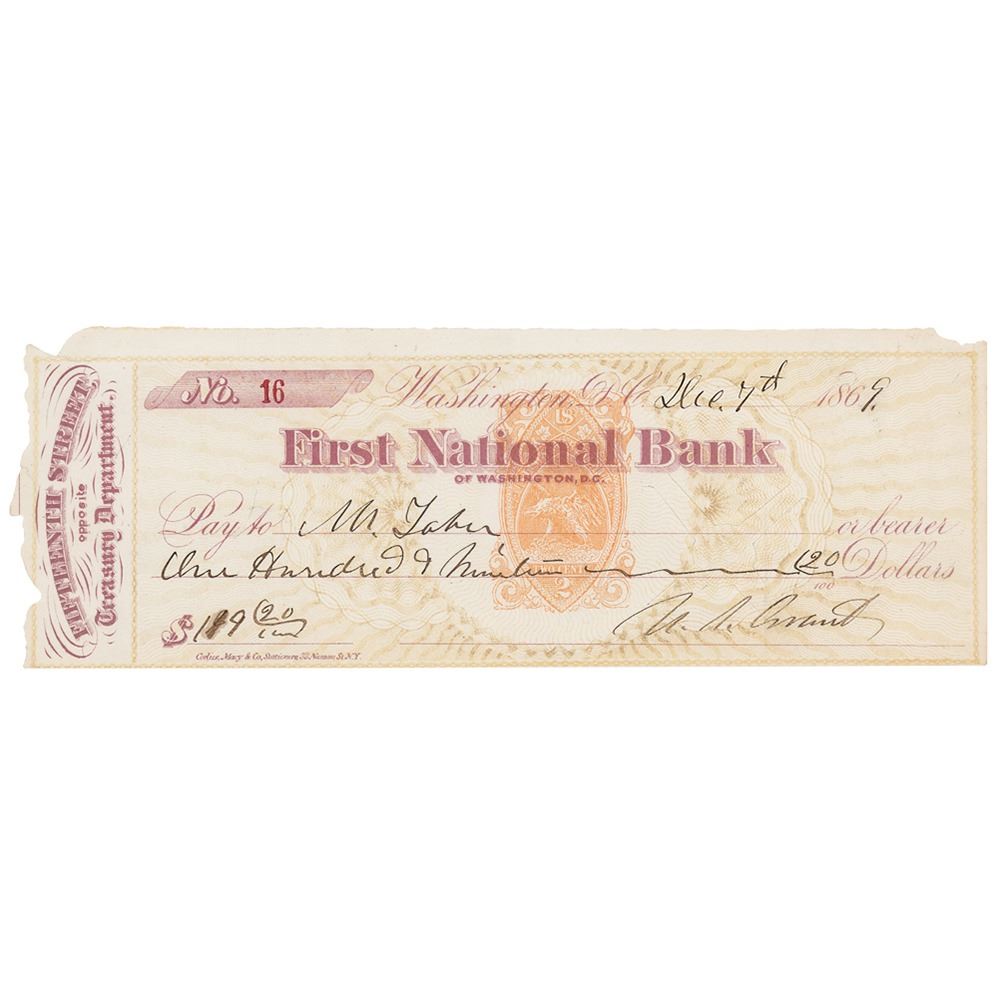 Desirable First National Bank check, 8 x 2.75, filled out and signed by Grant as president, "U. S. Grant," payable to Mr. Taber for $119.20, December 7, 1869. In fine condition, with minor edge loss.