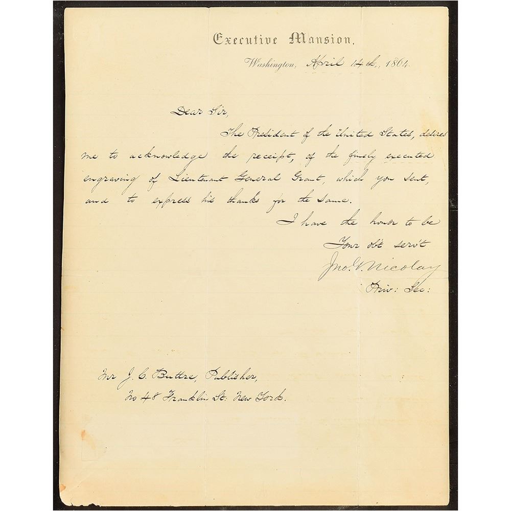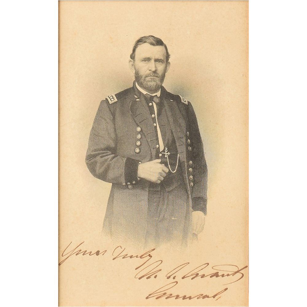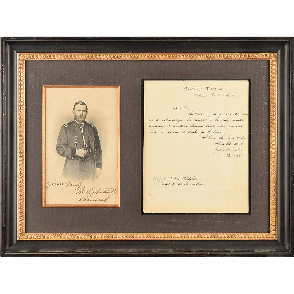 Superb engraved portrait of Ulysses S. Grant as commander of the Union Army, 5.5 x 8.75, prominently signed below the image in ink, "Yours truly, U. S. Grant, General." Includes a related letter signed by the private secretary of Abraham Lincoln, "Jno. G. Nicolay," one page, Executive Mansion letterhead, April 14, 1864, to publisher J. C. Butler in New York, in part: "The President of the United States, desires me to acknowledge the receipt, of the finely executed engraving of Lieutenant General Grant, which you sent, and to express his thanks for the same." Attractively matted and framed side-by-side to an overall size of 22 x 16.5. In very good to fine condition, with light soiling, and an unobtrusive crease passing across Grant's chest. President Lincoln promoted Grant to the rank of lieutenant general and commander of all Union forces on March 10, 1864; he held the position until 1869, when he took office as president.
