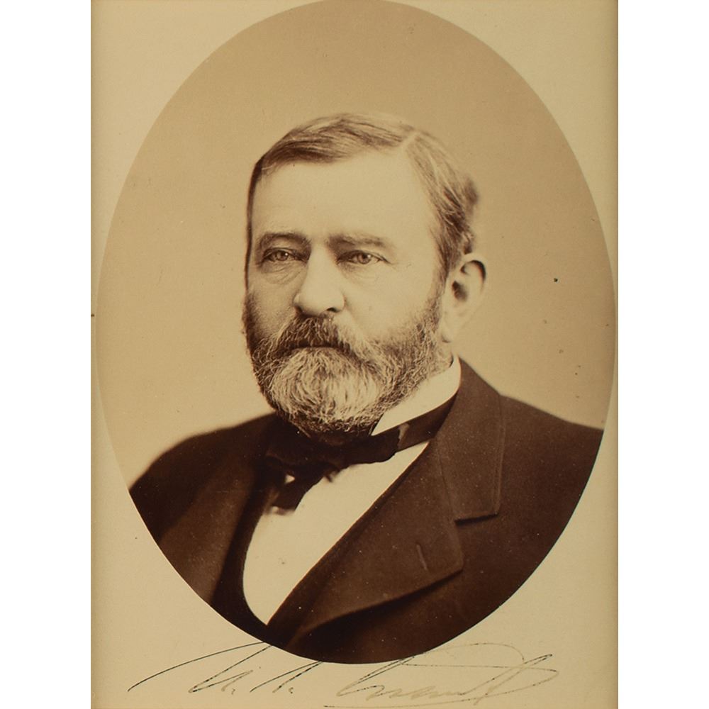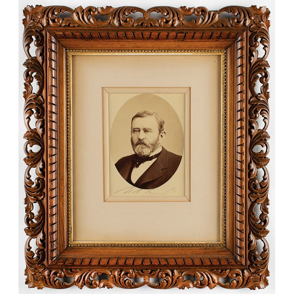 Exceptional vintage matte-finish 4 x 5.25 oval portrait of U. S. Grant, signed in black ink. Double-matted and displayed under glass in a beautifully carved period frame from J. S. Bradley of New York, which measures to an overall size of 13 x 14.5. In fine condition, with a semicircular crease to the top, and the signature light but fully legible.