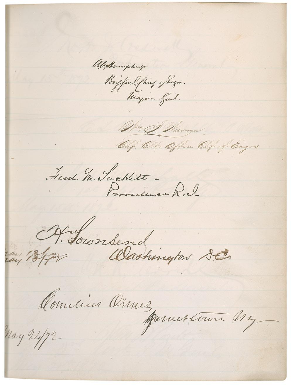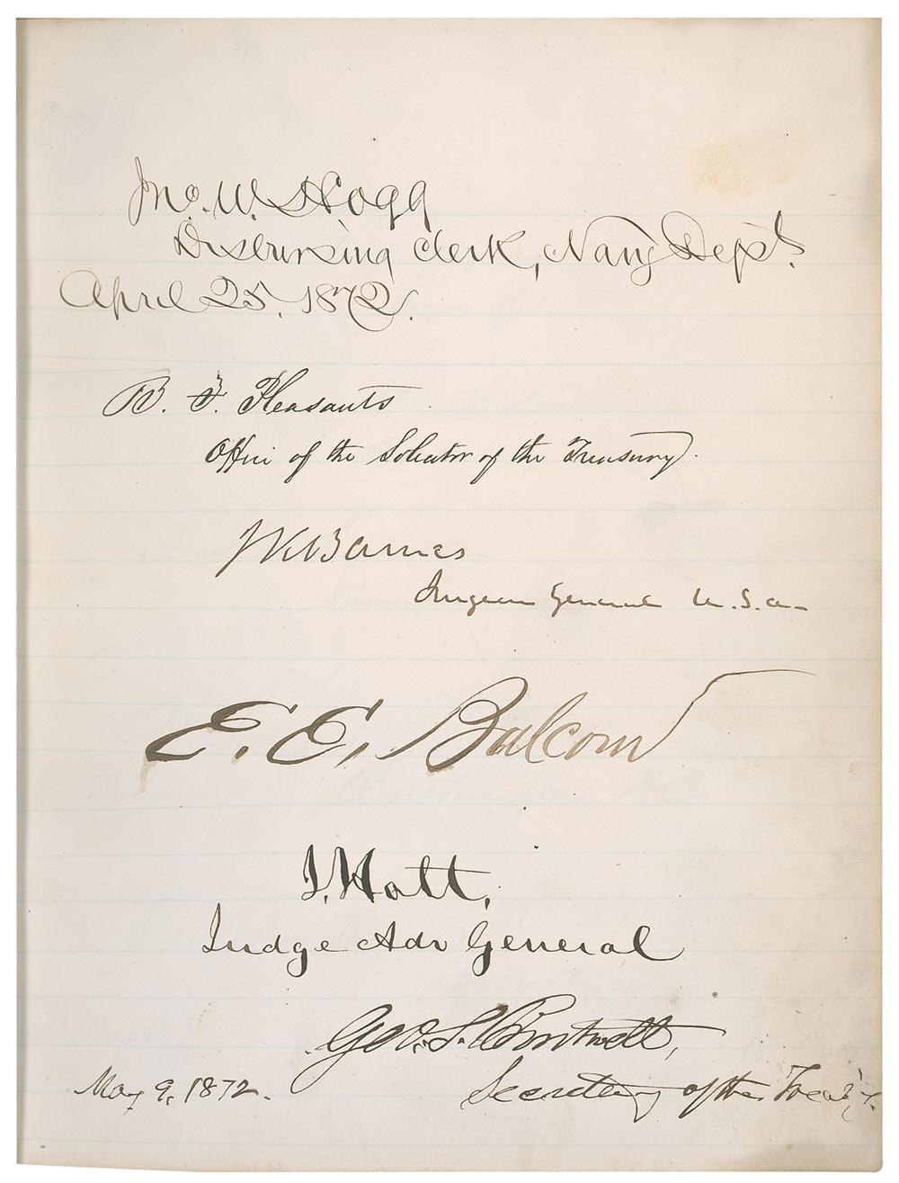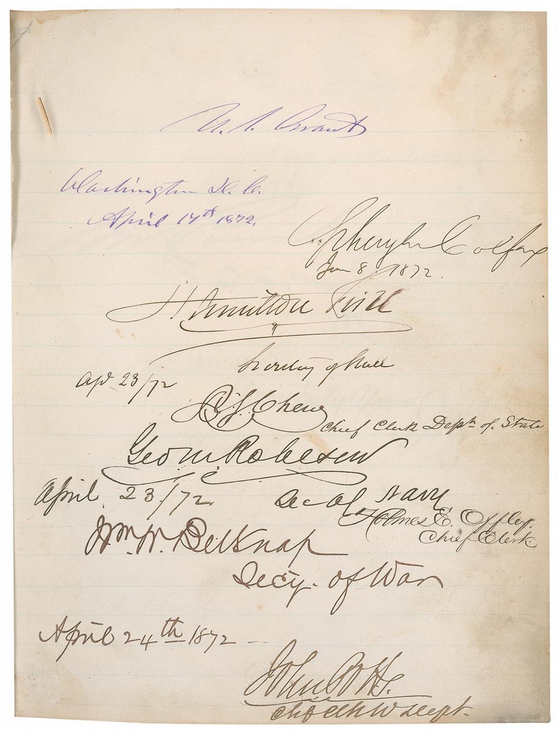 Hardcover autograph album, 7.5 x 9.5, entitled “Autographs Collected by Col Emmons.” Signed inside on the first lightly line page in purple ink “U. S. Grant, Washington, D.C., April 14th, 1872.” The same page is signed in fountain pen by Vice President Schuyler Colfax, Hamilton Fish (Secretary of State), William W. Belknap (Secretary of War), George M. Robeson (Secretary of the Navy), and two other officials. The subsequent pages are signed by several other Cabinet members and federal officials including George S. Boutwell (Secretary of the Treasury) and John A. J. Creswell (Postmaster General). Moderate soiling to the page signed by Grant with the first few subsequent pages showing mild soiling and staining, moderate to heavy staining and wear to the front and back boards and spine, and the front cover partially separated along the hinge, otherwise very good condition. A unique collection from the 18th President of the United States and his most trusted advisors.