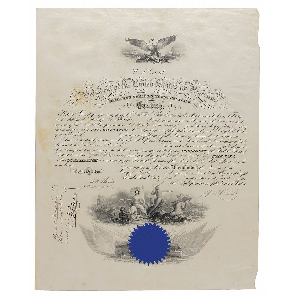 Two items: Partly-printed DS as president, one page, 15.75 x 20, March 26, 1869. President Grant appoints George A. Baldy to the position of “Master in the Navy.” Signed at the conclusion by Grant, and countersigned by Secretary of the Navy Adolph Borie. Light creasing and wear to right edge, some scattered light toning, and a few wrinkles and creases, otherwise fine condition. The blue seal is crisp and intact. Grant naval documents are decidedly uncommon. Accompanied by two related Naval Department documents regarding Baldy’s appointment; and a partly-printed DS, one page, 12.5 x 18.5, June 12, 1866, Naval Academy diploma issued to George A. Baldy stating he “has completed the prescribed course of study at the United States Naval Academy and has successfully passed the required examination before the Academic Board.” Signed at the bottom by Admiral David D. Porter as Superintendent. Double matted to an overall size of 18 x 24. In very good condition, with scattered creasing and foxing, mainly to lower portion, a few small areas of paper loss, and a few spots of toning. Despite its flaws, an attractive document.