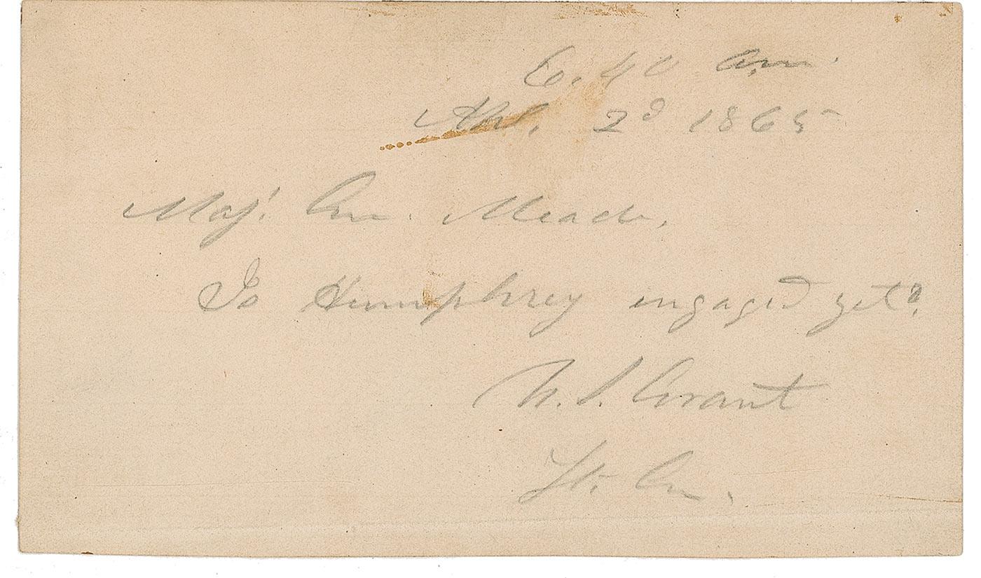 War-dated brief ALS, in pencil, signed “U. S. Grant, Lt. Gen,” one page, 5 x 3, April 2, 1865. An urgent military query to General George Meade, in full: “6:40 am, April 2d, 1865, Maj Gen Meade, Is Humphrey engaged yet? U. S. Grant, Lt. Gen.” In very good condition, with some scattered light soiling, a couple of small stains touching the date, a crease below the signature, a few wrinkles, and mounting remnants on reverse.