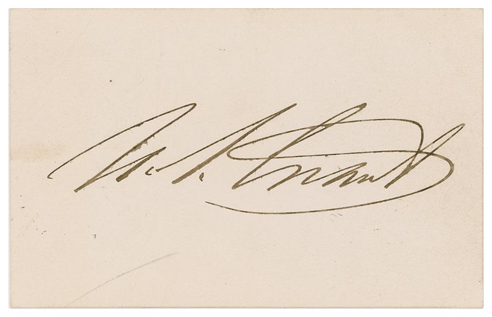 Ink signature, “U. S. Grant,” on an off-white 3.5 x 2.5 card. In fine condition, with a bit of scattered light toning.