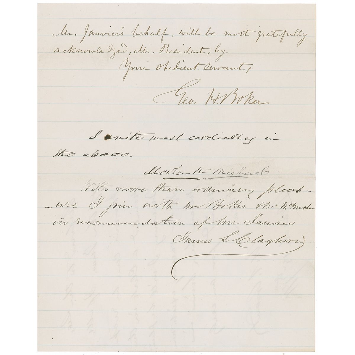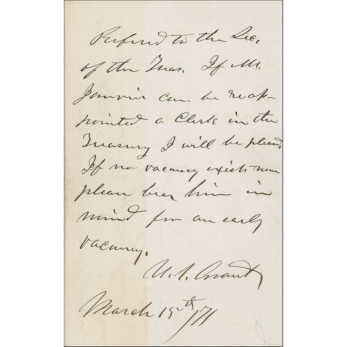 On the reverse of the second page, Grant writes: “Referred to the Sec of the Treas. If Mr. Janvier can be reappointed a Clerk in the Treasury I will be pleased. If no vacancy exists now please bear him in mind for an early vacancy. U. S. Grant March 15th / 71.” The second page also bears two more endorsements: “I unite most cordially in the above. Morton McMichael” and “With more than ordinary pleasure I join with Mr Boker & McMichael in recommendation of Mr. Janvier. James L. Claghorn.” In very good condition, with a vertical fold through Grant’s endorsement and through one letter of signature, professional strengthening to one horizontal fold, a strip of light toning to left side of endorsed panel, and some scattered light creases.