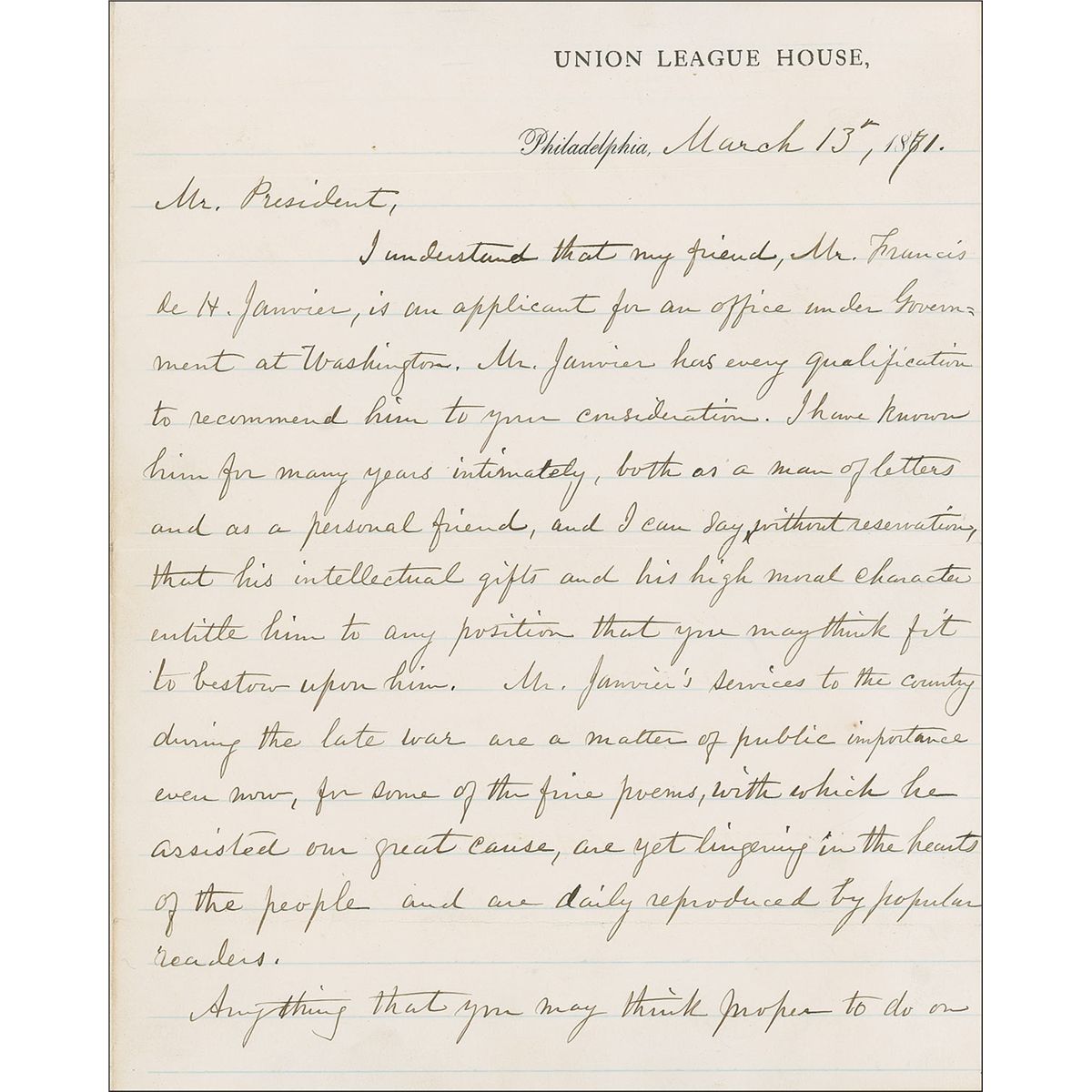 Handwritten endorsement, signed as president, “U. S. Grant,” on the reverse of the second integral page of a two-page lightly-lined ALS written by George H. Boker, 7.75 x 9.75 , dated March 13, 1871, to Grant, seeking an appointment for a friend. Boker writes, in full: “I understand that my friend, Mr. Francis de H. Janvier is an applicant for an office under Government at Washington. Mr. Janvier has every qualification to recommend him to your consideration. I have known him for many years intimately, both as a man of letters and as a personal friend, and I can say without reservation, that his intellectual gifts and his high moral character entitle him to any position that you may think fit to bestow upon him. Mr. Janvier’s services to the country during the late war are a matter of public importance even now, for some of the fine poems, with which he assisted our great cause, are yet lingering in the hearts of the people and are daily reproduced by populist readers. Anything that you may think proper to do on Mr. Janvier’s behalf will be most gratefully acknowledged.”
