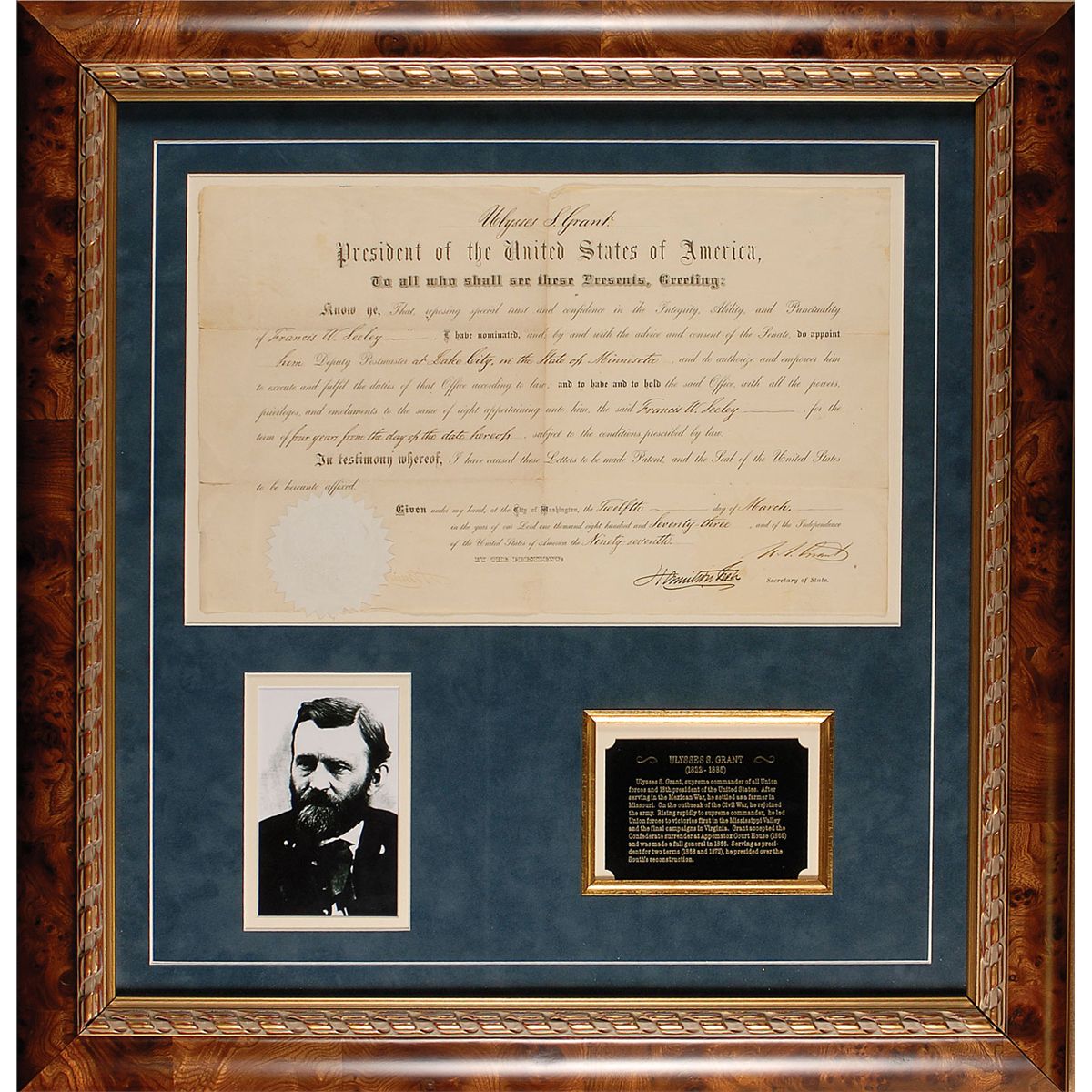 Partly-printed DS as president, one page, 17 x 10.5, March 12, 1873. President Grant apppoints Francis W. Seeley to be the Deputy Postmaster of Lake City, Minnesota. Signed at the bottom by Grant and countersigned by Secretary of State Hamilton Fish. Suede matted and framed with a portrait and a biographical plaque to an overall size of 26.25 x 27.5. In very good condition, with a few small separations along intersecting folds, scattered toning and soiling, and some light mirroring to Fish’s signature. The white seal is crisp and intact. Oversized.