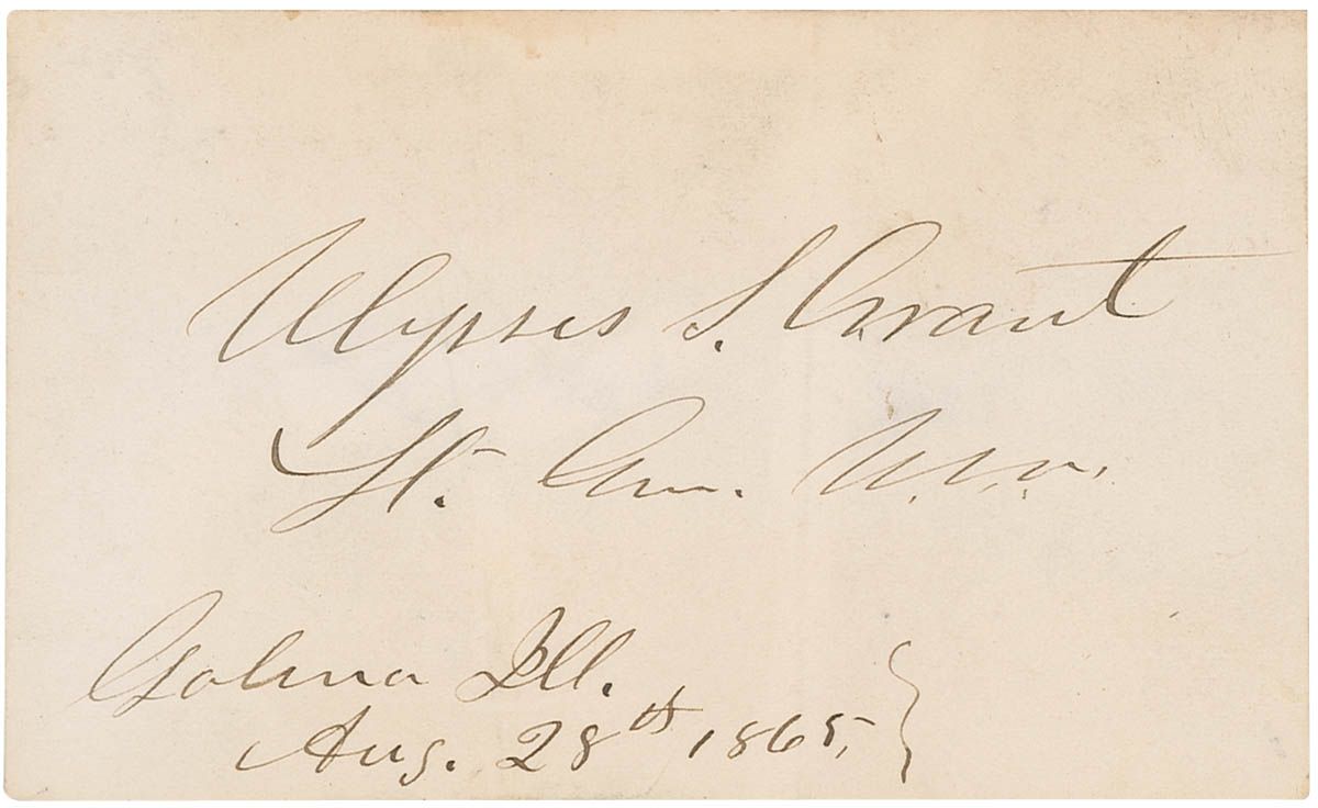 Ink signature, “Ulysses S. Grant, Lt. Gen. U.S.A., Galena, Ill., Aug. 28th, 1865,” on an off-white 4 x 2.5 card. In fine condition, with light scattered toning and soiling. Grant had returned to Galena, his hometown, on August 18, welcomed by a jubilant populous excited to see its new war hero. There were parades, fireworks, and speeches given, and Grant was presented with a house, which he lived in until becoming president. An astoundingly rare signature from his triumphant return at the end of the Civil War, this is the first and only full signature we have ever seen or heard of.