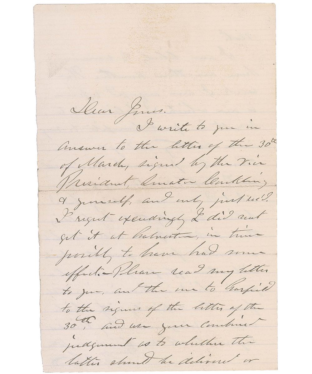 John P. Jones, this letter’s recipient, was a longtime Republican senator from Nevada who, around this time same, had criticized President James A. Garfield for various appointments. Most notably, both Jones and Grant objected to the president’s appointment of William Henry Robertson as collector at the port of New York—without soliciting the advice of powerful New York politician Roscoe Conkling. Grant had written to Senator Jones to express his support of the senator’s outrage and their shared position. The former chief executive also sent a letter to Garfield, using Jones as the courier, as is mentioned here. In the wake of the accusations, Garfield purportedly defended his appointments and maintained that the Grant had been ‘deceived by gross exaggerations and deliberate misrepresentations as to the motives and purposes of the President.’ The message to Grant, according to published newspaper articles, was delayed in finding its way. An important and historically significant letter regarding a message from a former president to a successor.